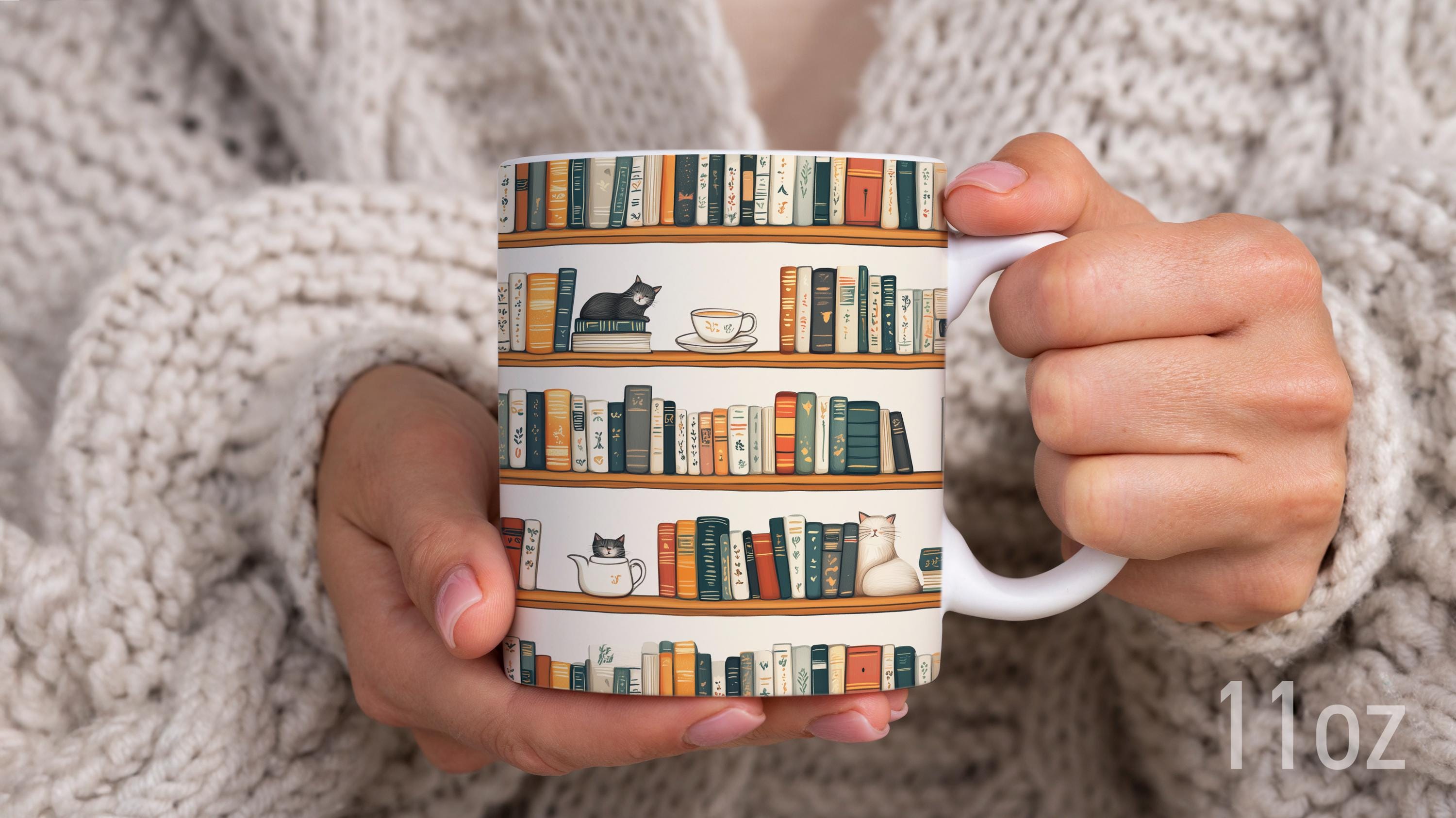 Bookshelf with Cats Mug, Cats and Books Mug, Mug for Cat and Book L...