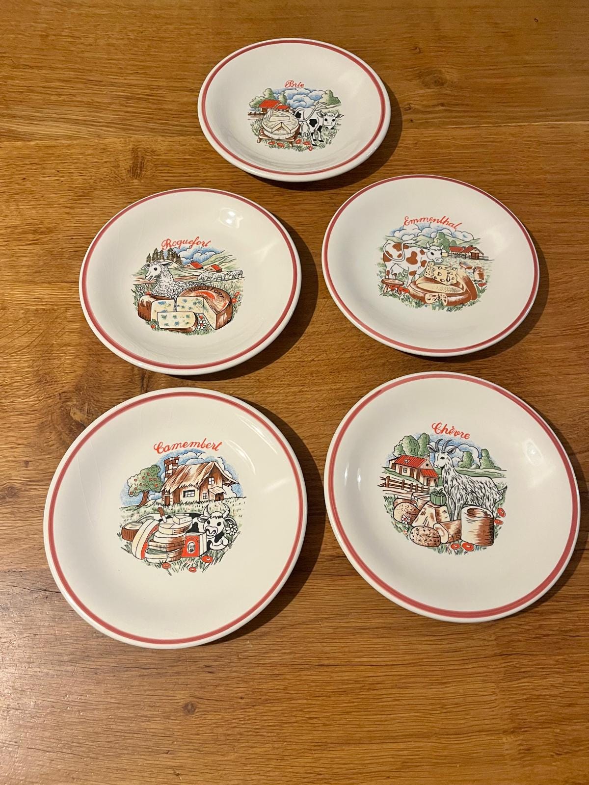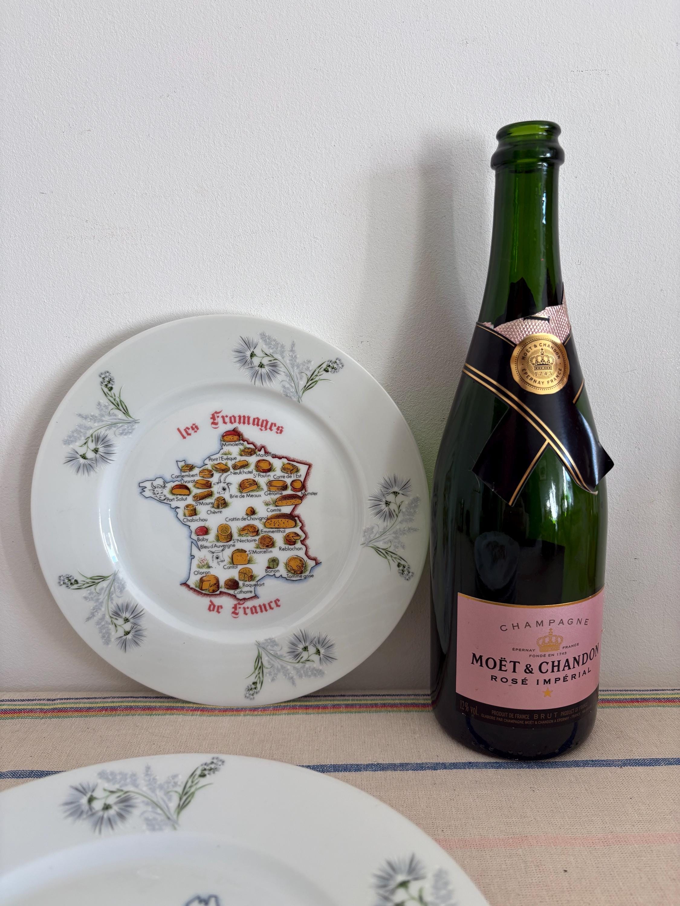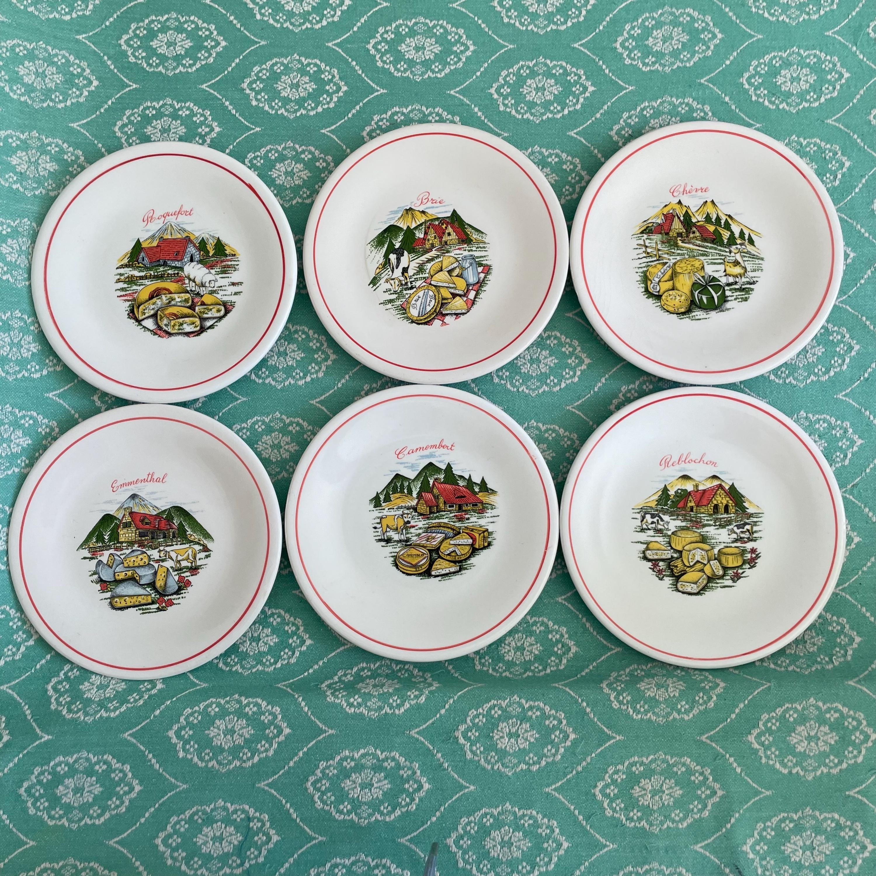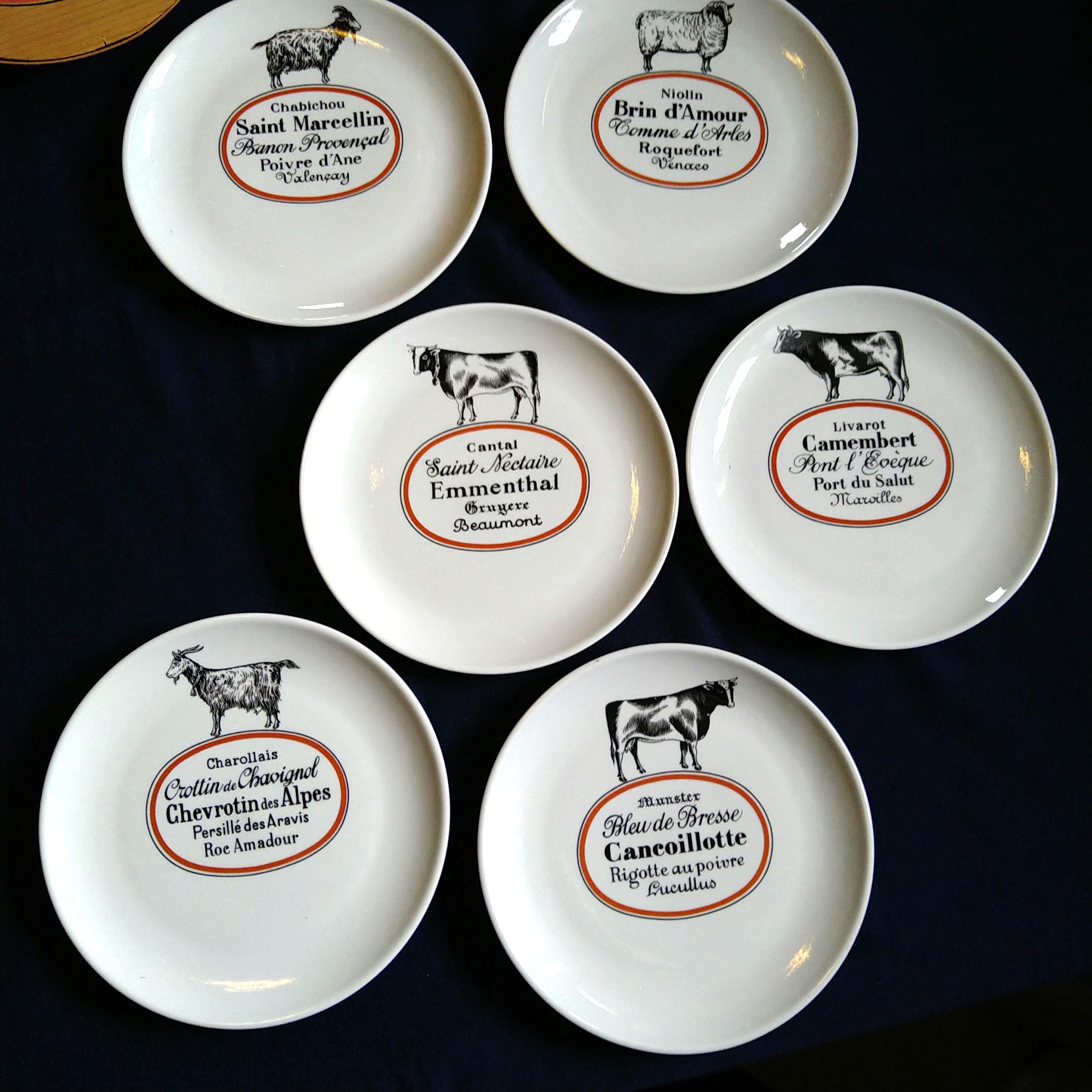 "Set of five matching cheese plates with a map of France showing where each famous French chees...