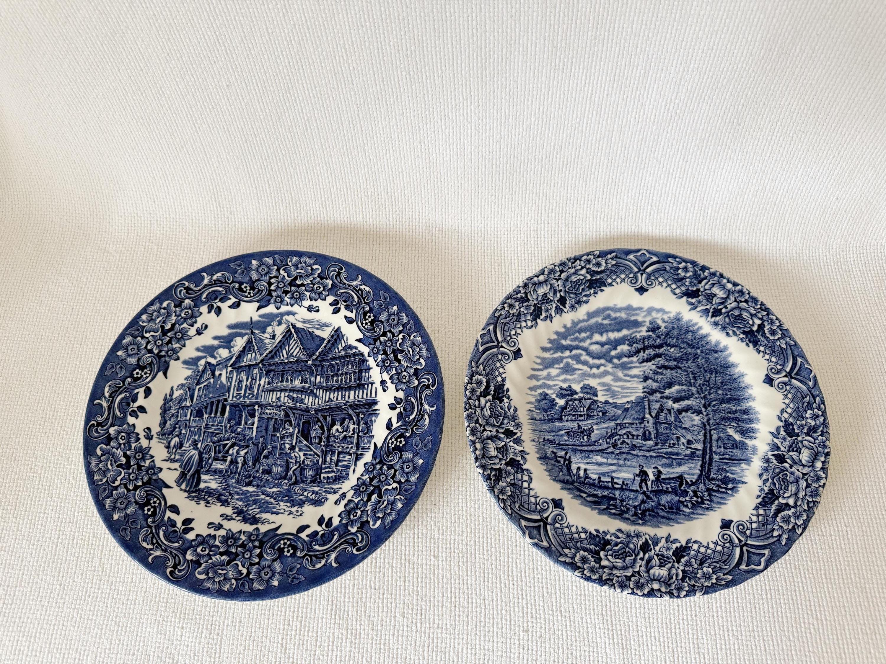 Beautiful decorated round blue and white England dinning plates. Used good condition. No chips or cr...