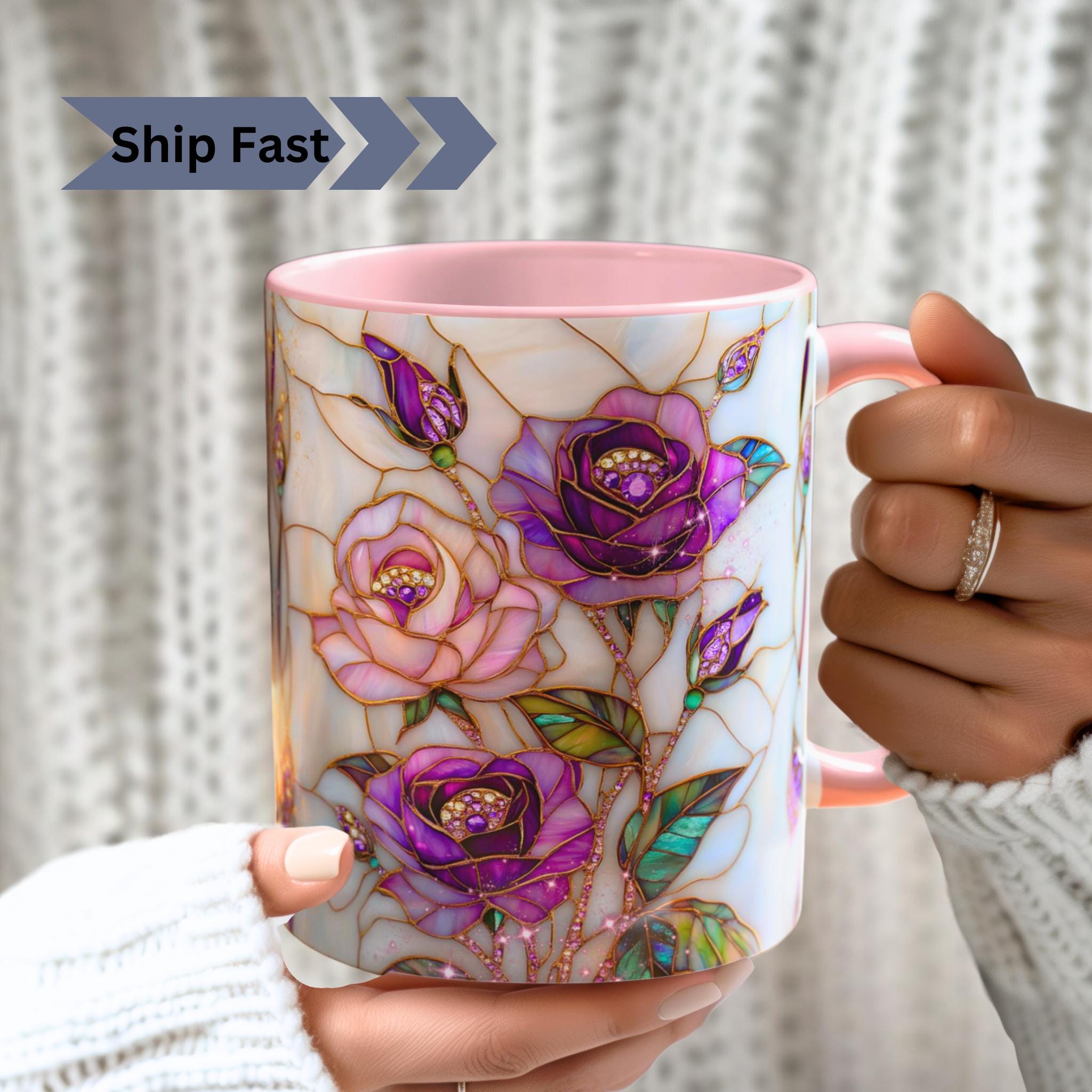 "Sip in elegance with this enchanting mug featuring lavender and pink roses in a luminous stain...