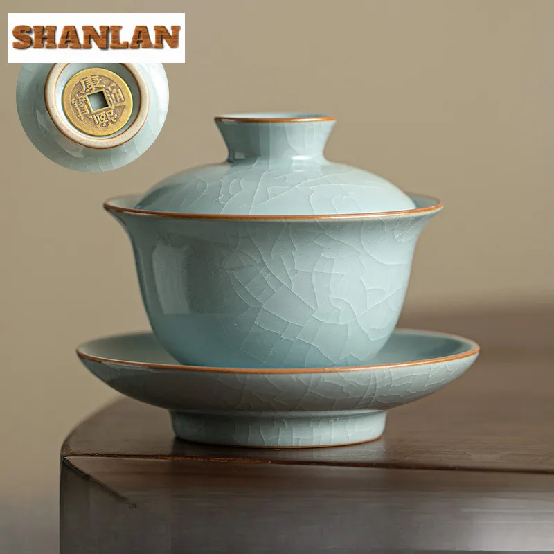 145ml Azure Ru Kiln Ice Cracked Glaze Gaiwan Handmade Copper Coin Base Tea Tureen Tea Brewing Cover ...