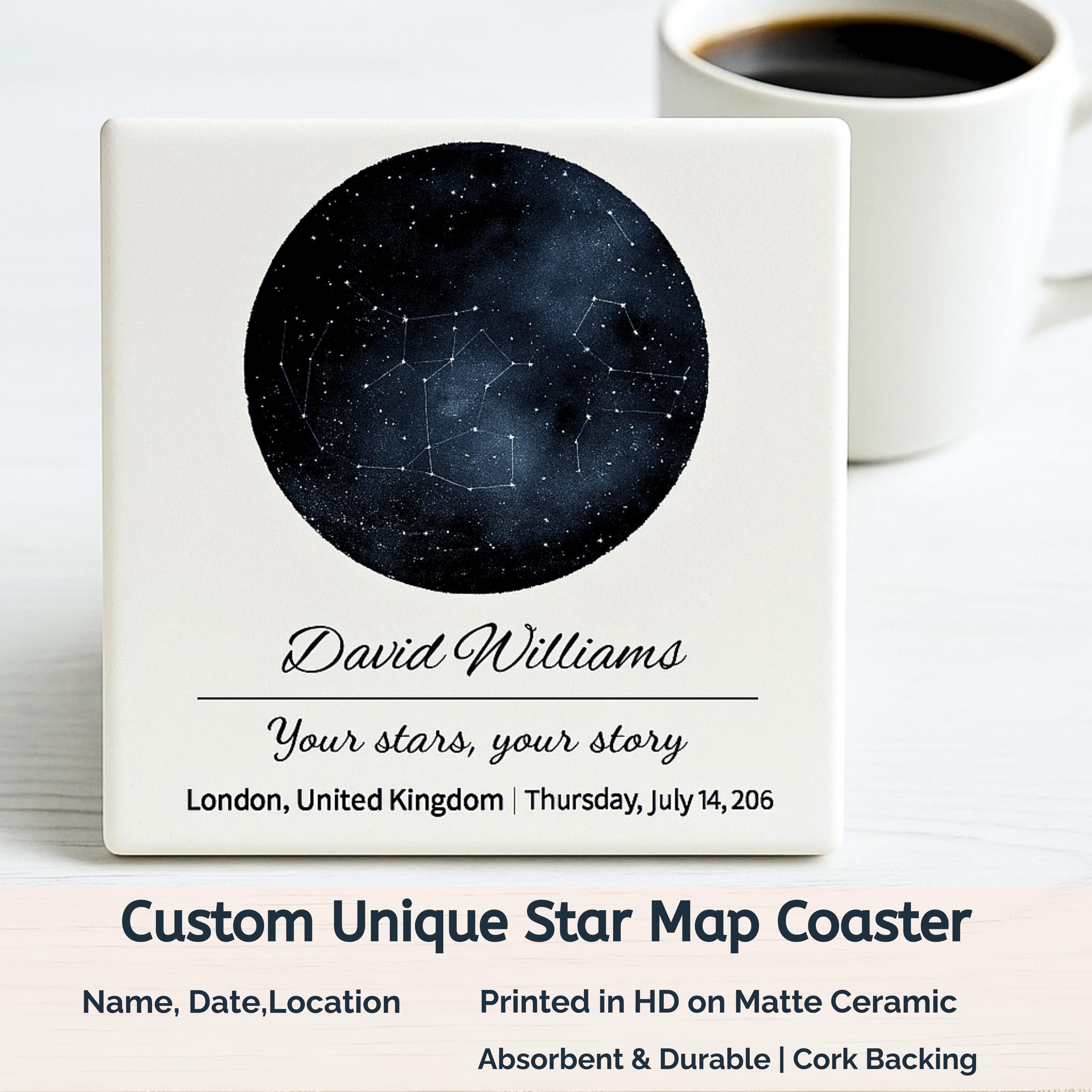 "Your stars, your story. Turn a special date and place into a stunning custom star map coaster ...