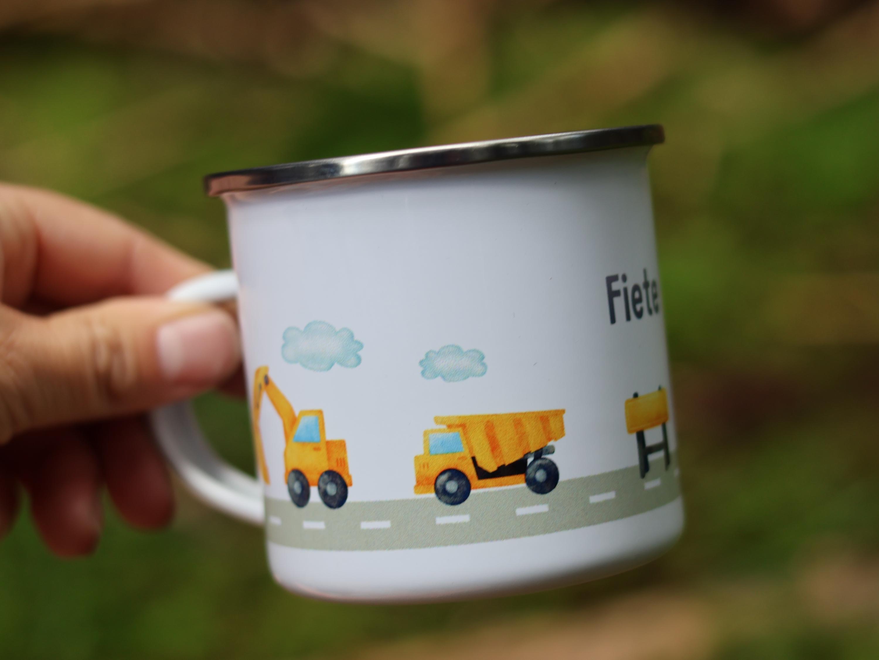 Enamel mug excavator with name, construction site, crane, personali...