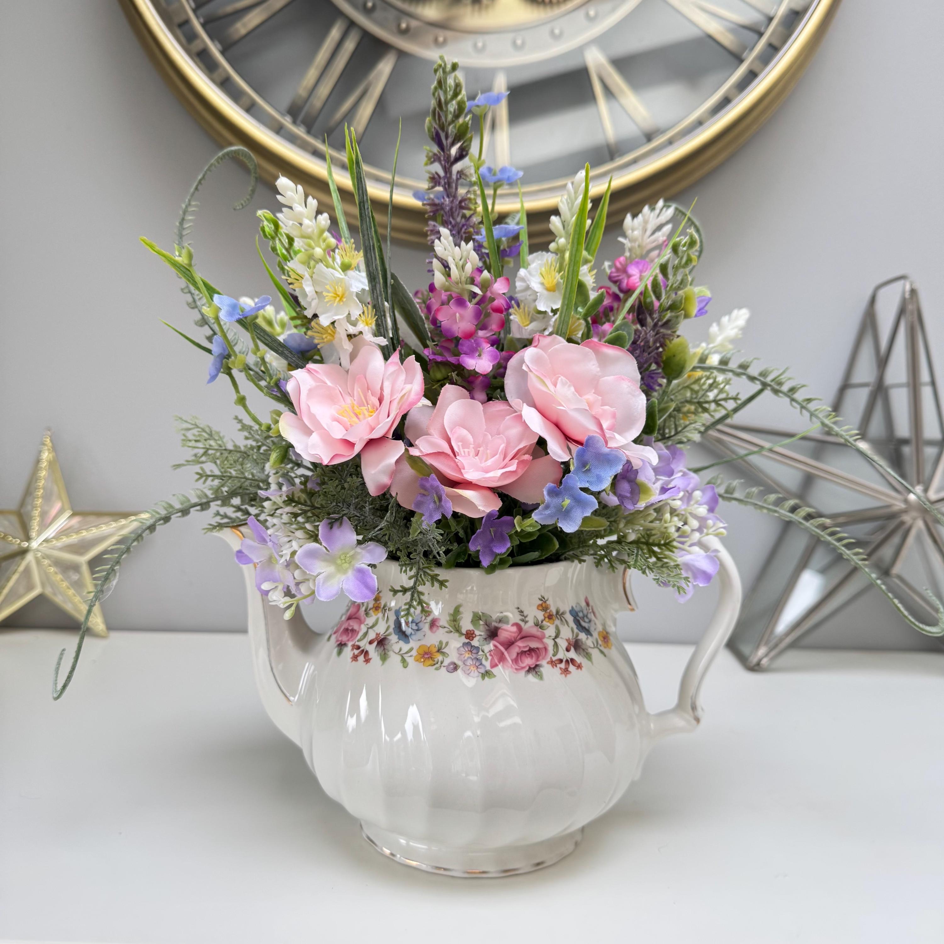 Artificial flower arrangement. Floral teapot. Bridgerton flowers. G...