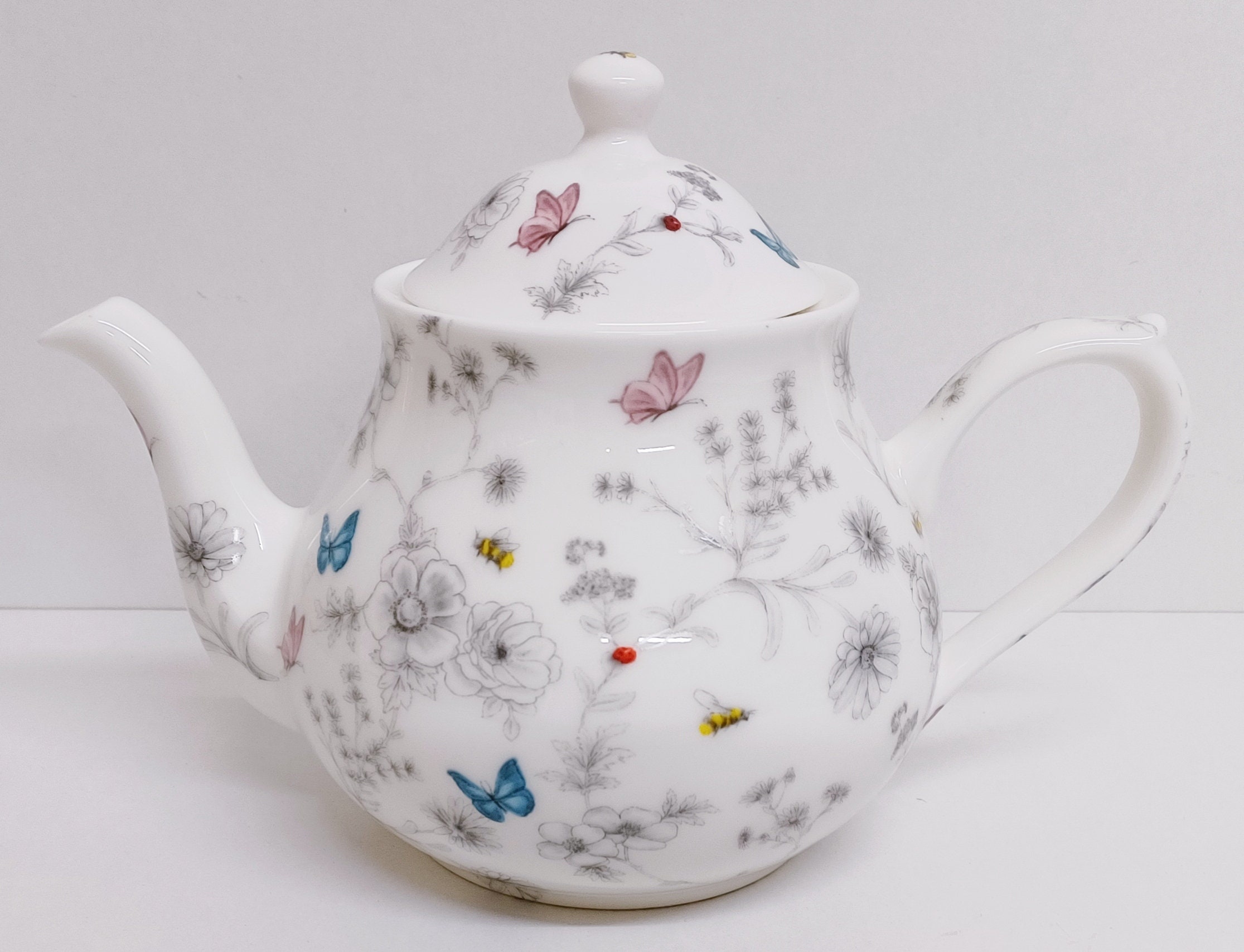White Fine Bone China Teapot Hand Decorated in the UK with Secret Garden Flowers Butterflies and Bee...