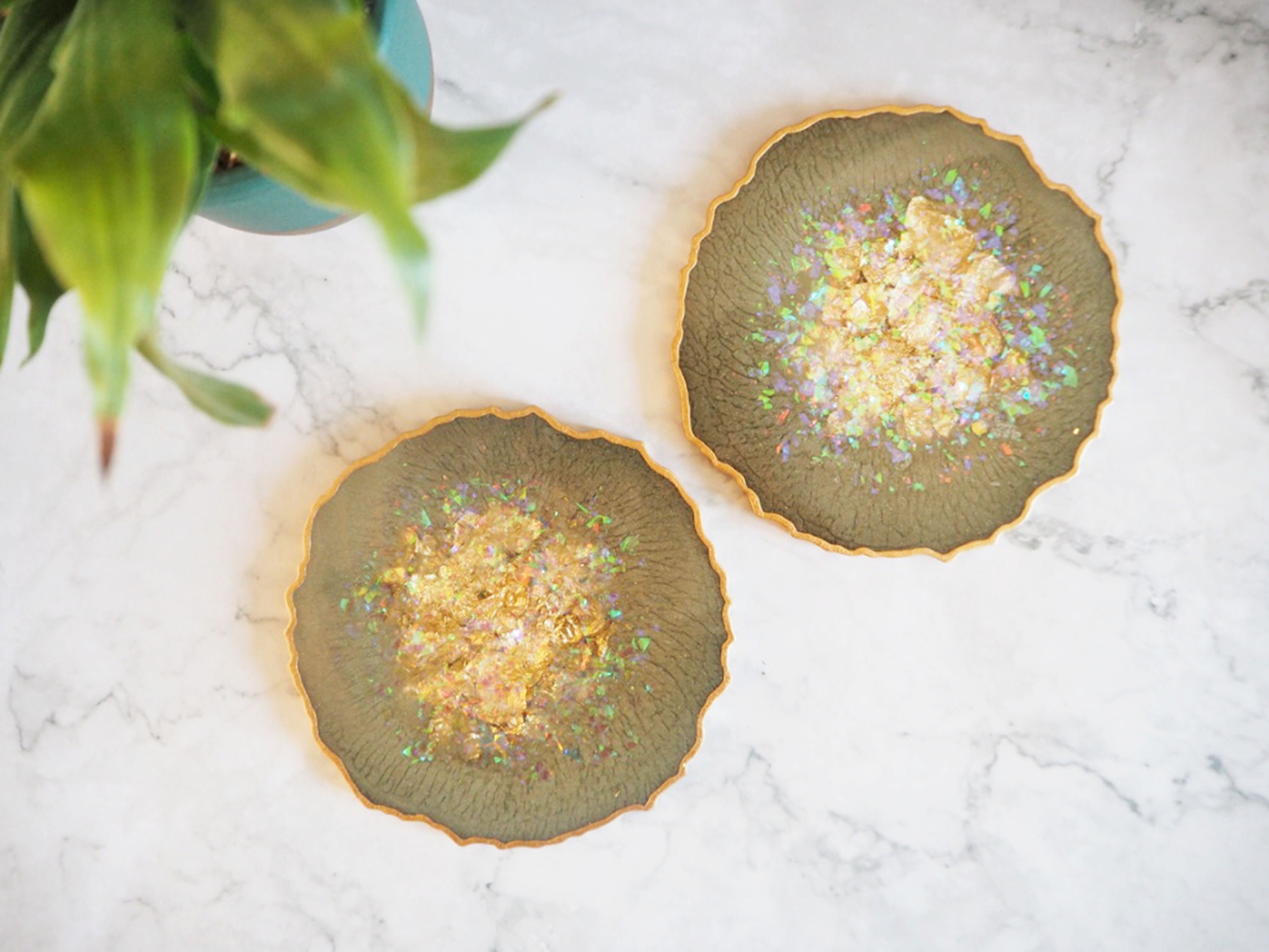 Olive Green Geode Resin Coaster Set. These handmade coasters are made with resin and a light olive g...