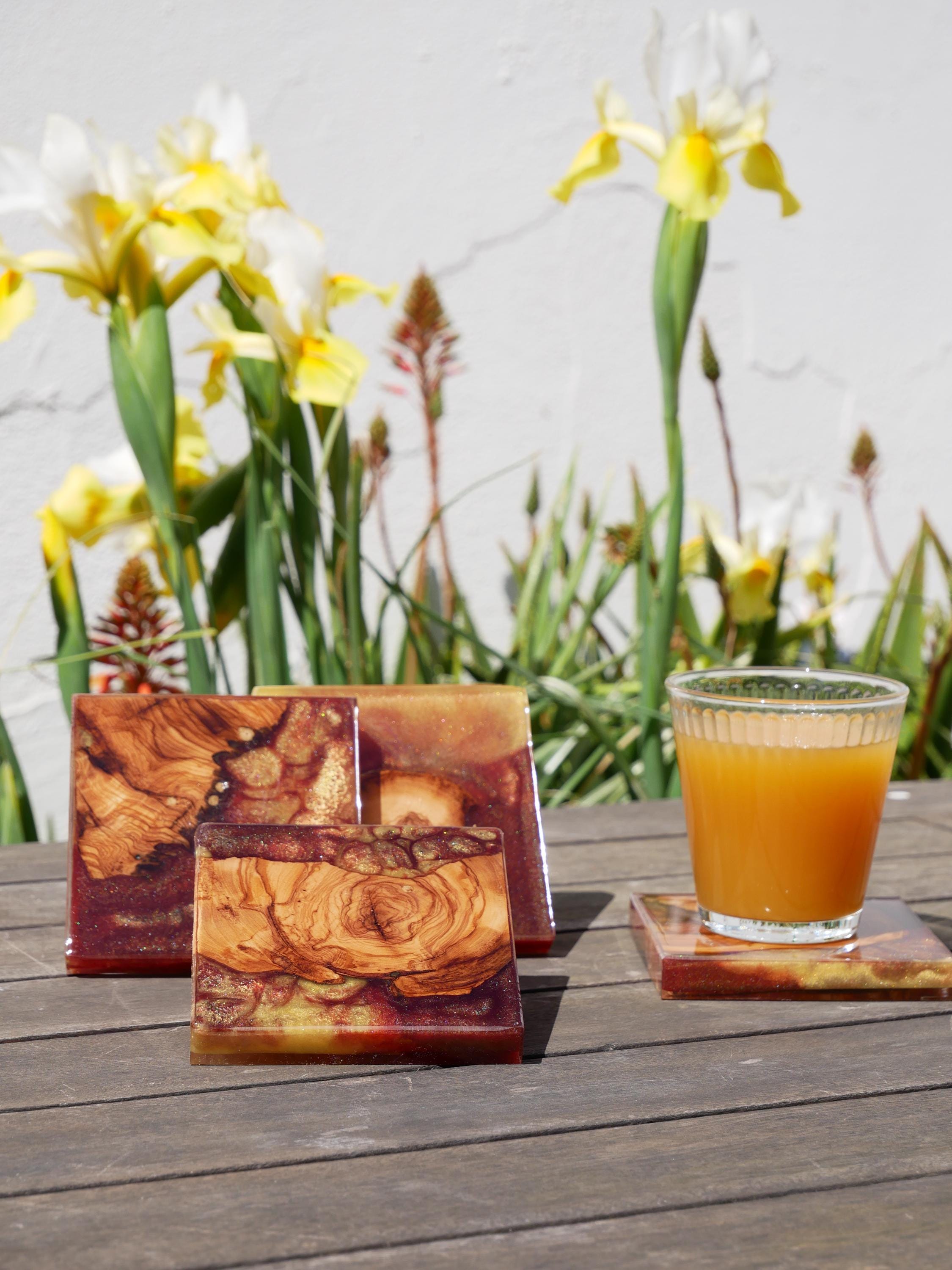 "Unique, funky and modern coaster sets made from olive wood and resin. These brilliant coasters...