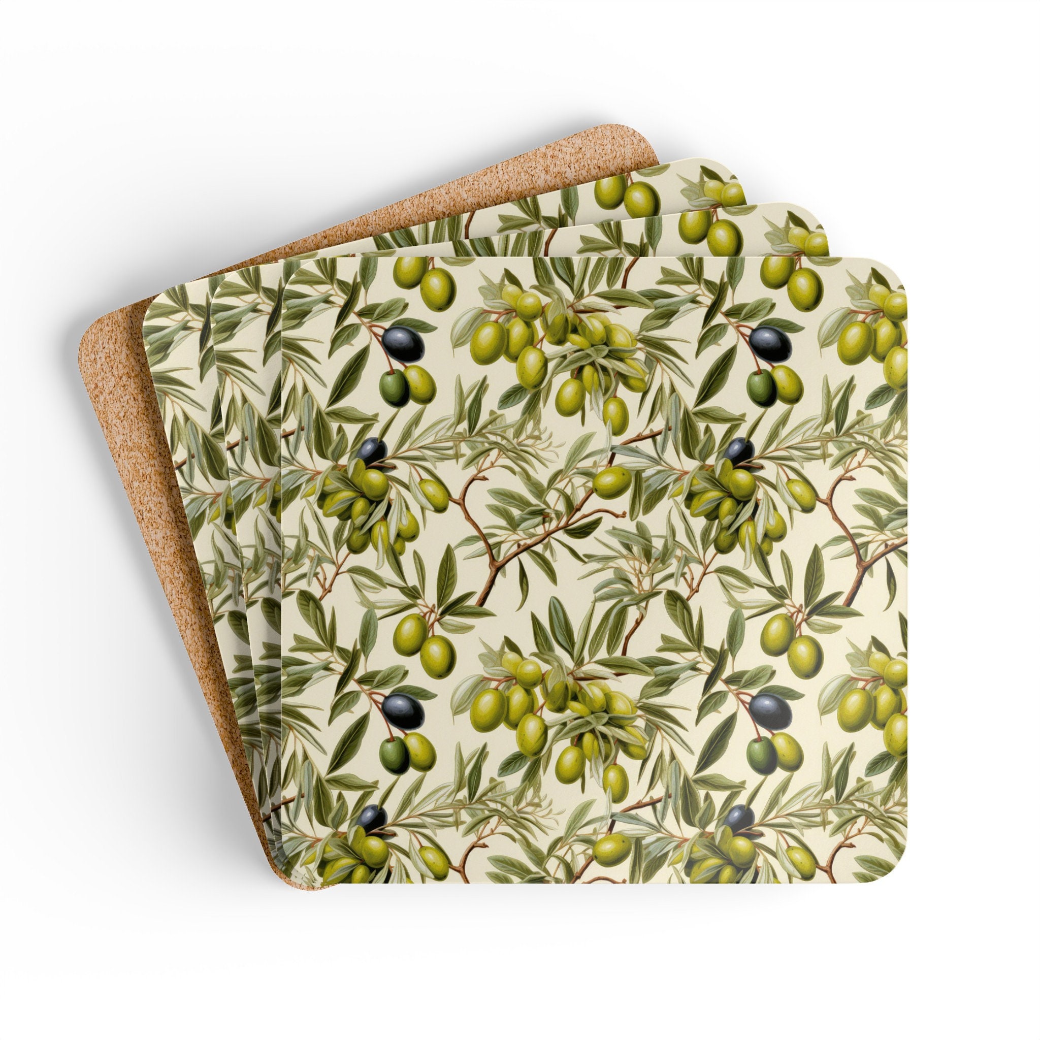 "Green Olives Cork Coaster Set, Olive Coasters, Mediterranean Decor, Olive Kitchen Coasters, Ol...