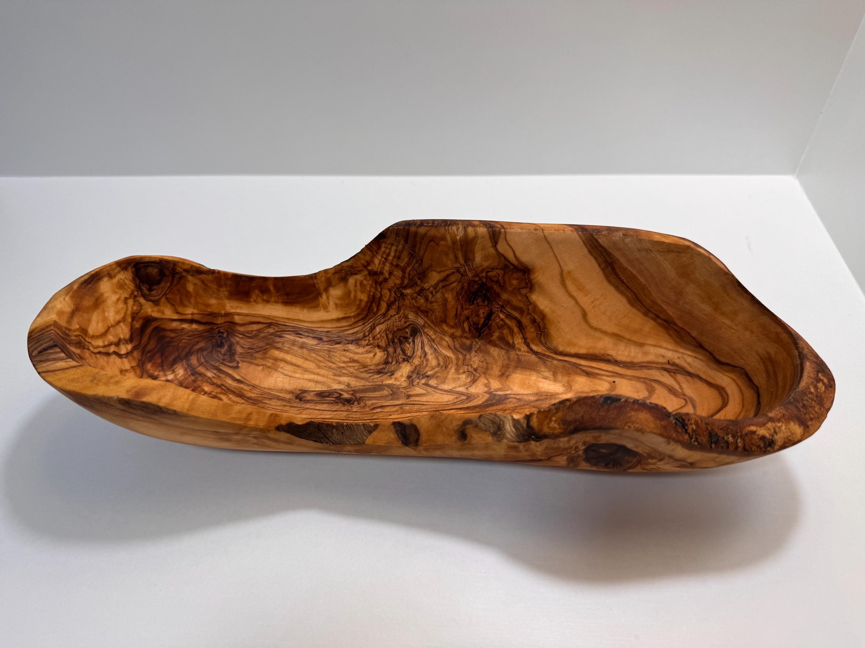 This handcrafted bowl made of genuine olive wood measures approximately 31 cm in length and 11 cm in...