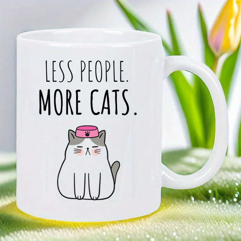 Cute Cat Lover'S White Ceramic Mug - 'Less People, More Cats' with Pink Hat Design, Perfect Gift for...