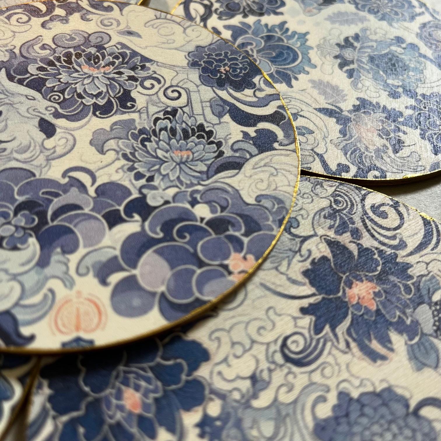 This is a set of 6 exquisitely designed wooden coasters featuring a classic blue and white chinoiser...