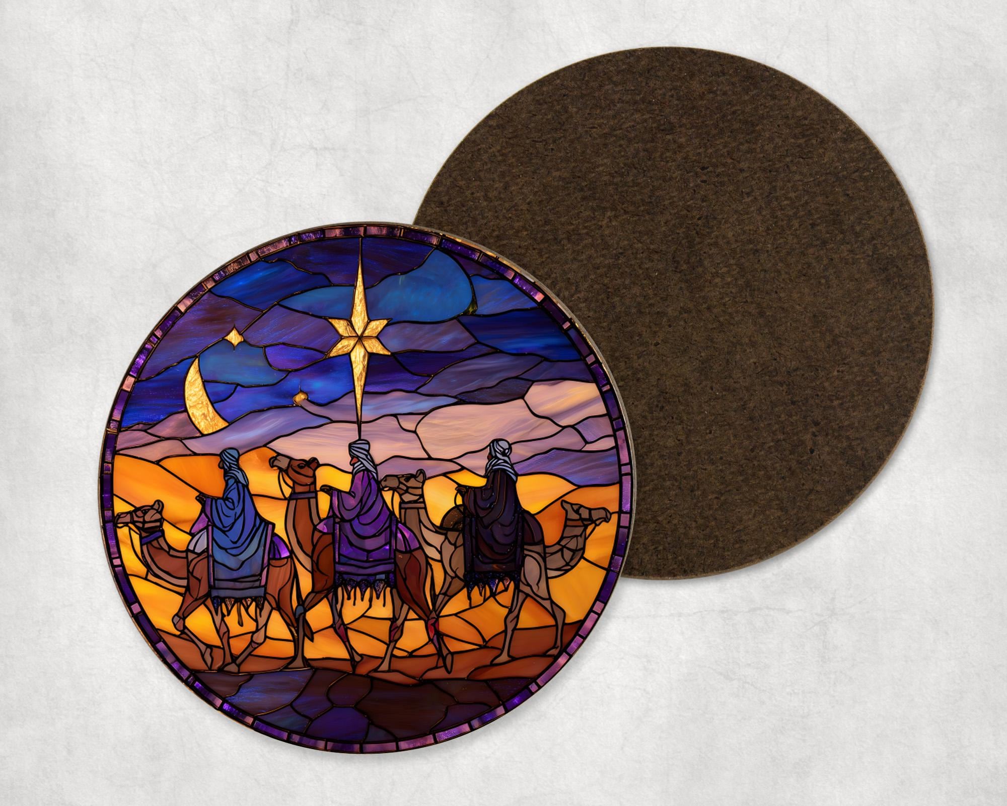 Three Wise Men Nativity Scene Stained Glass Style Round Coaster - C...