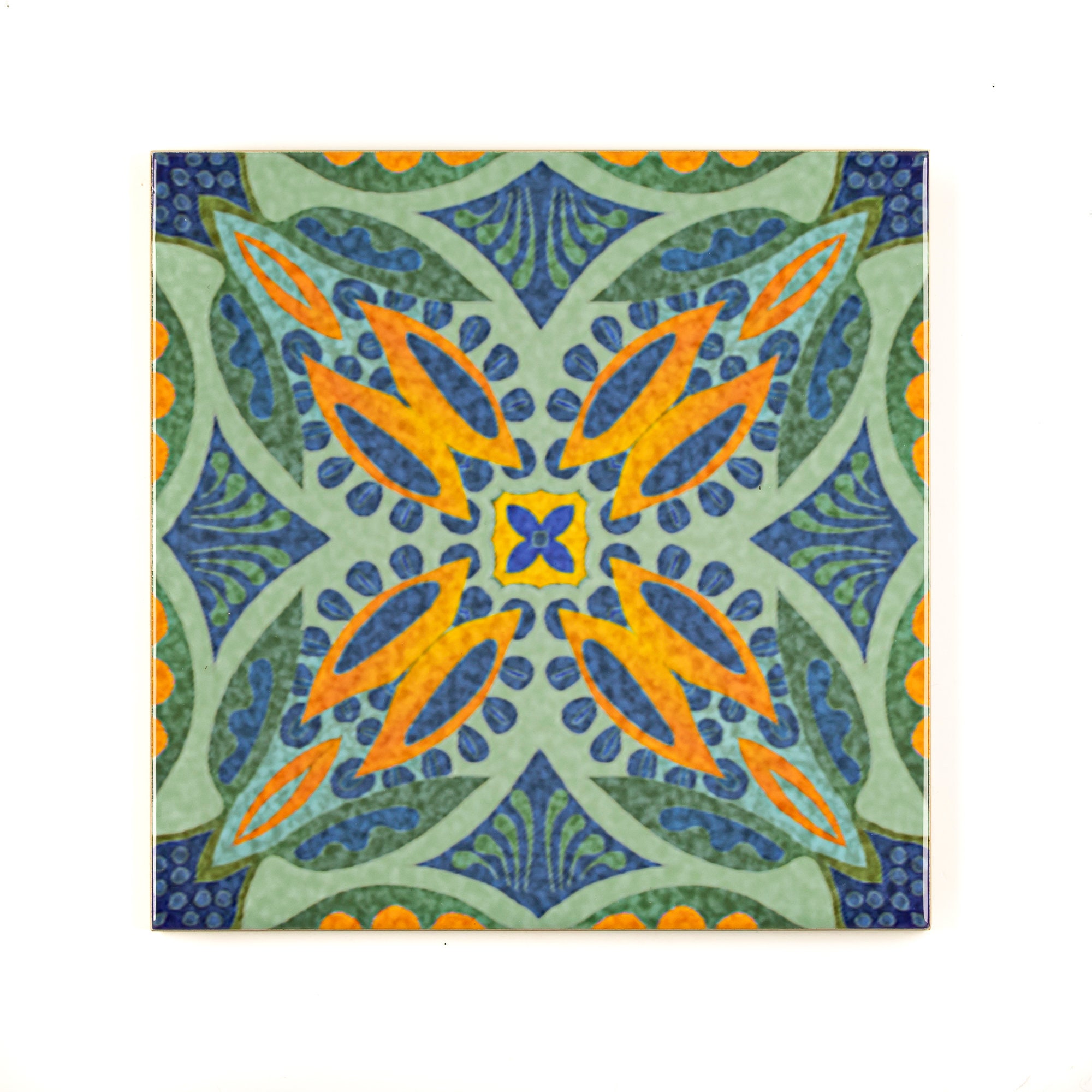 "A restrained, elegant green tile with a glowing orange central design. The design has strong A...