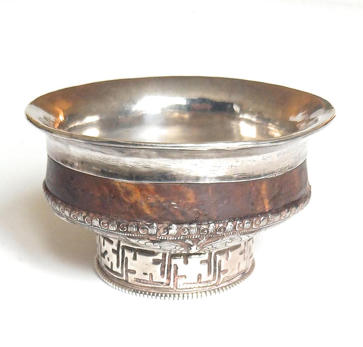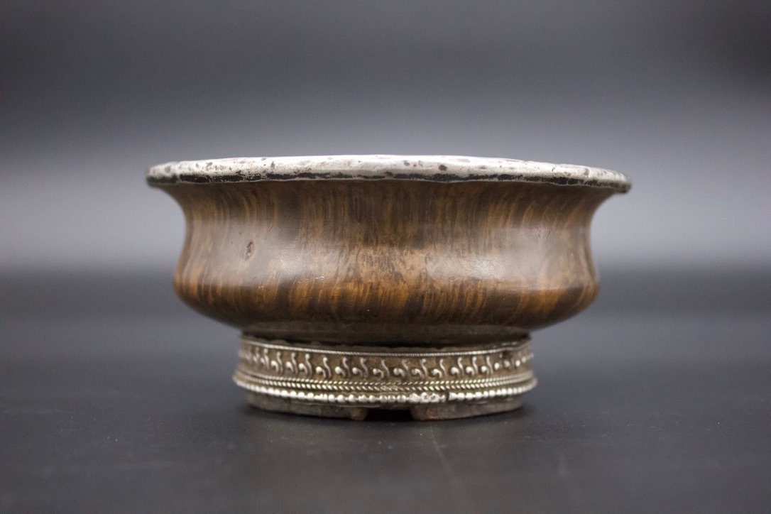 Antique Large Tibetan Silver Burl Wood Ceremonial Tea Cup- Silver A...