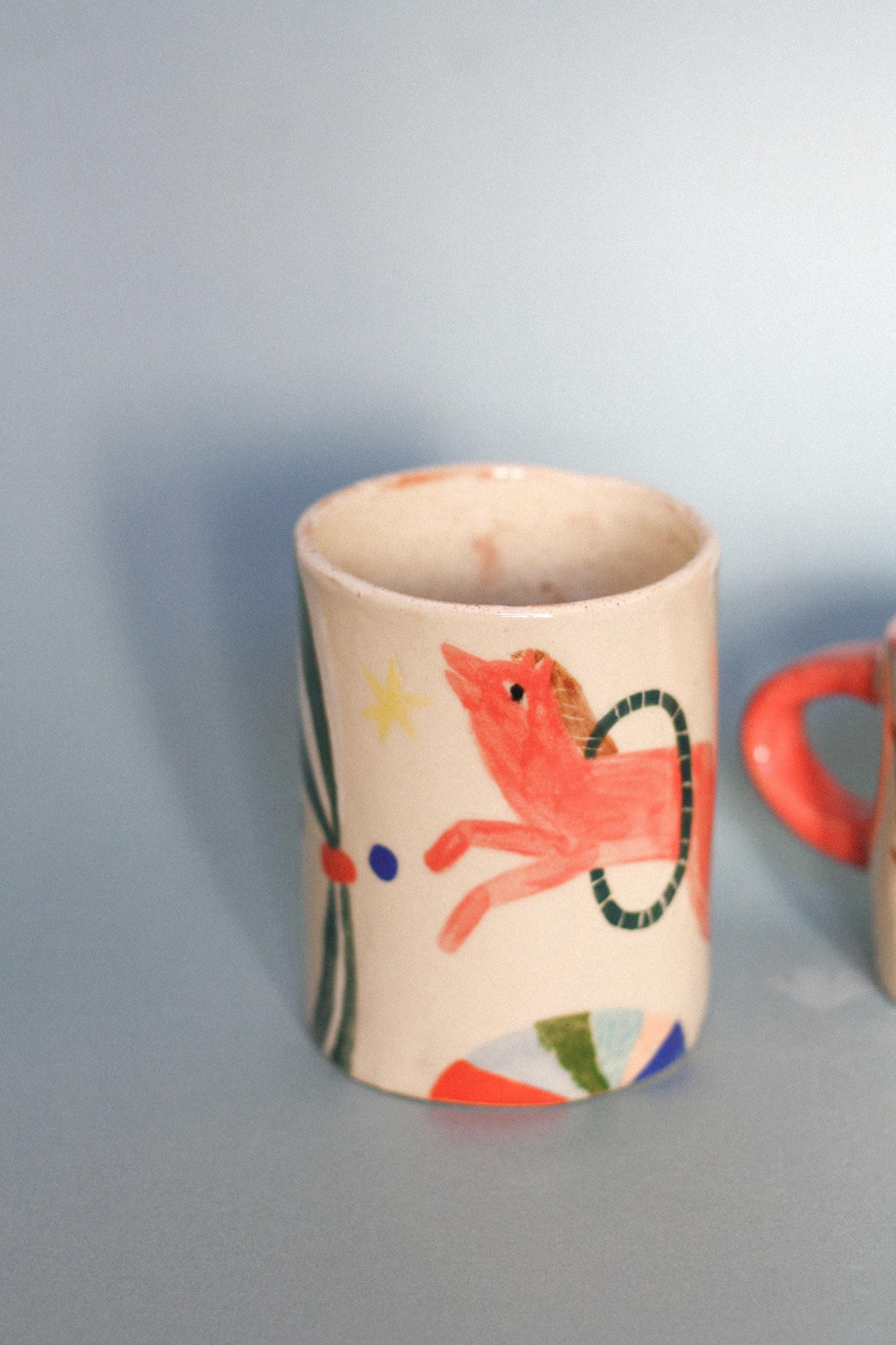 A handmade ceramic mug featuring a hand-painted Circus Scene with a horse and a curtain / face/ fish...