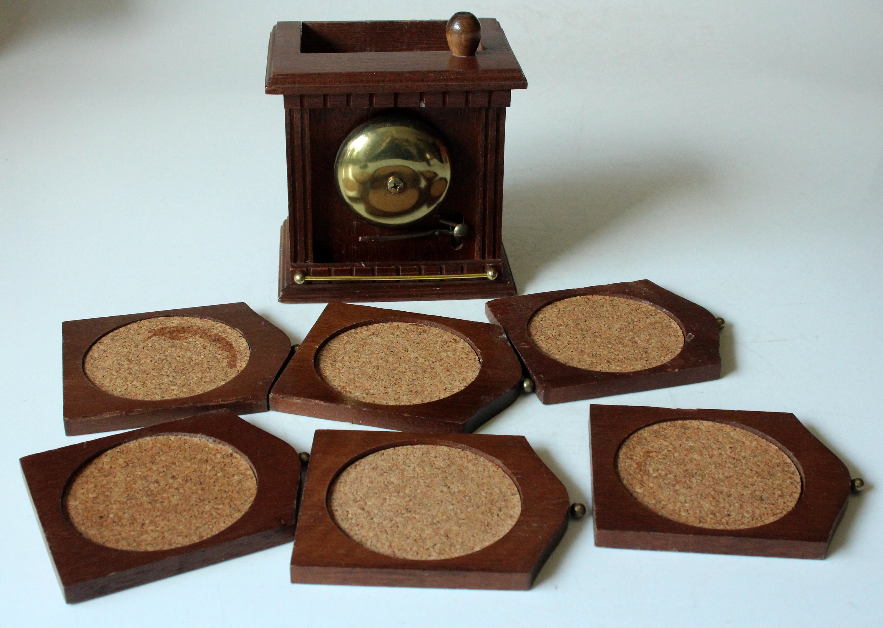 "6 wooden coasters in a decorative wooden box with a bell, vintage from the 1950s, mid-century....