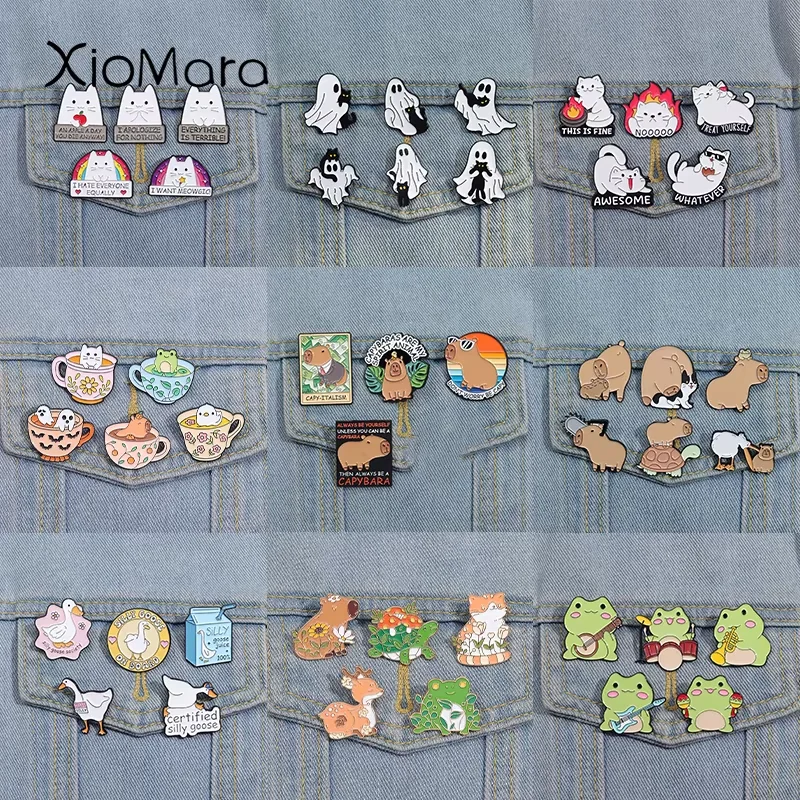 Cute Animals Enamel Pins 3-6pcs/Set Black White Cat Capybara Metal ...