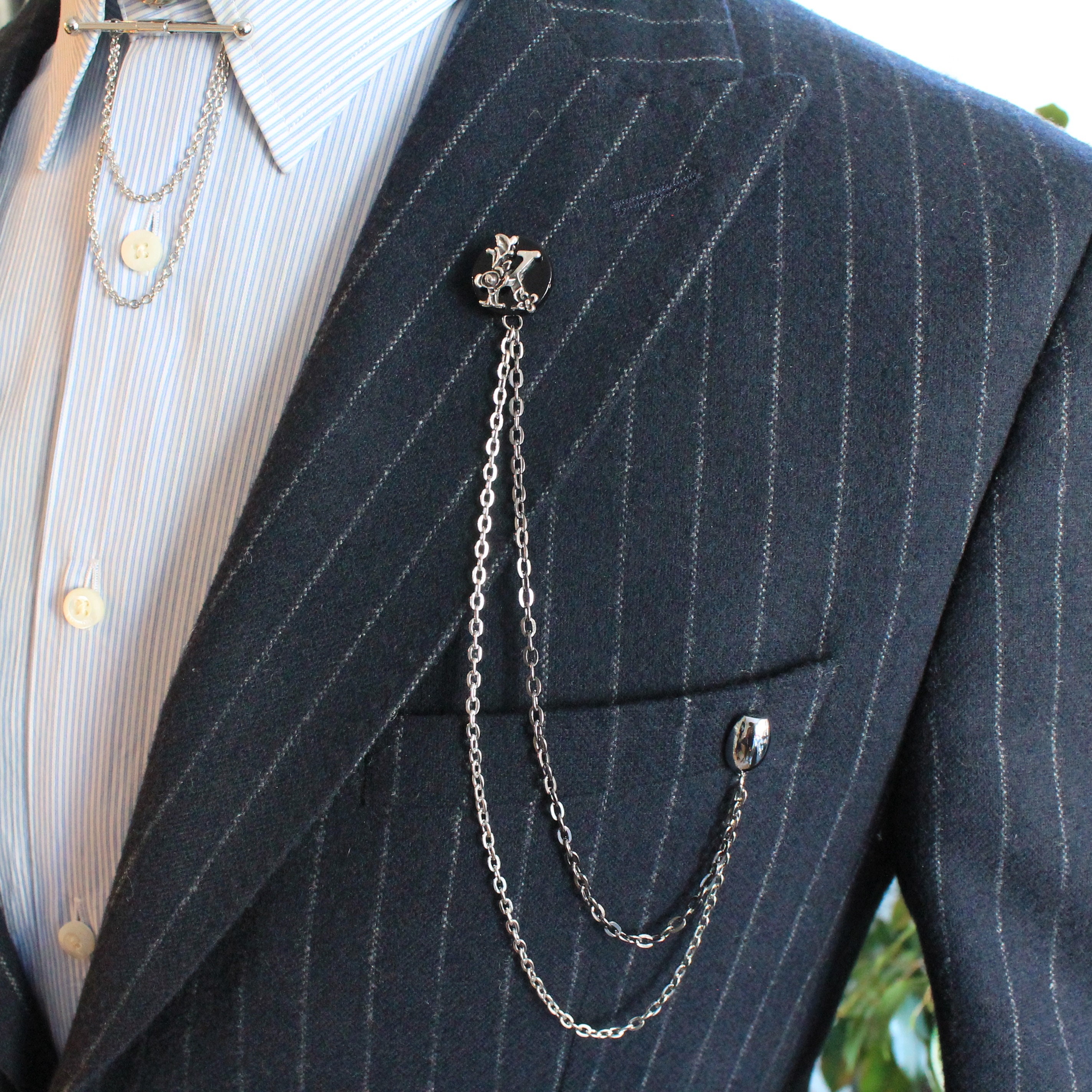 Black Onyx Initial Lapel Pin, Silver Chain Brooch,Men's Suit Jacket...