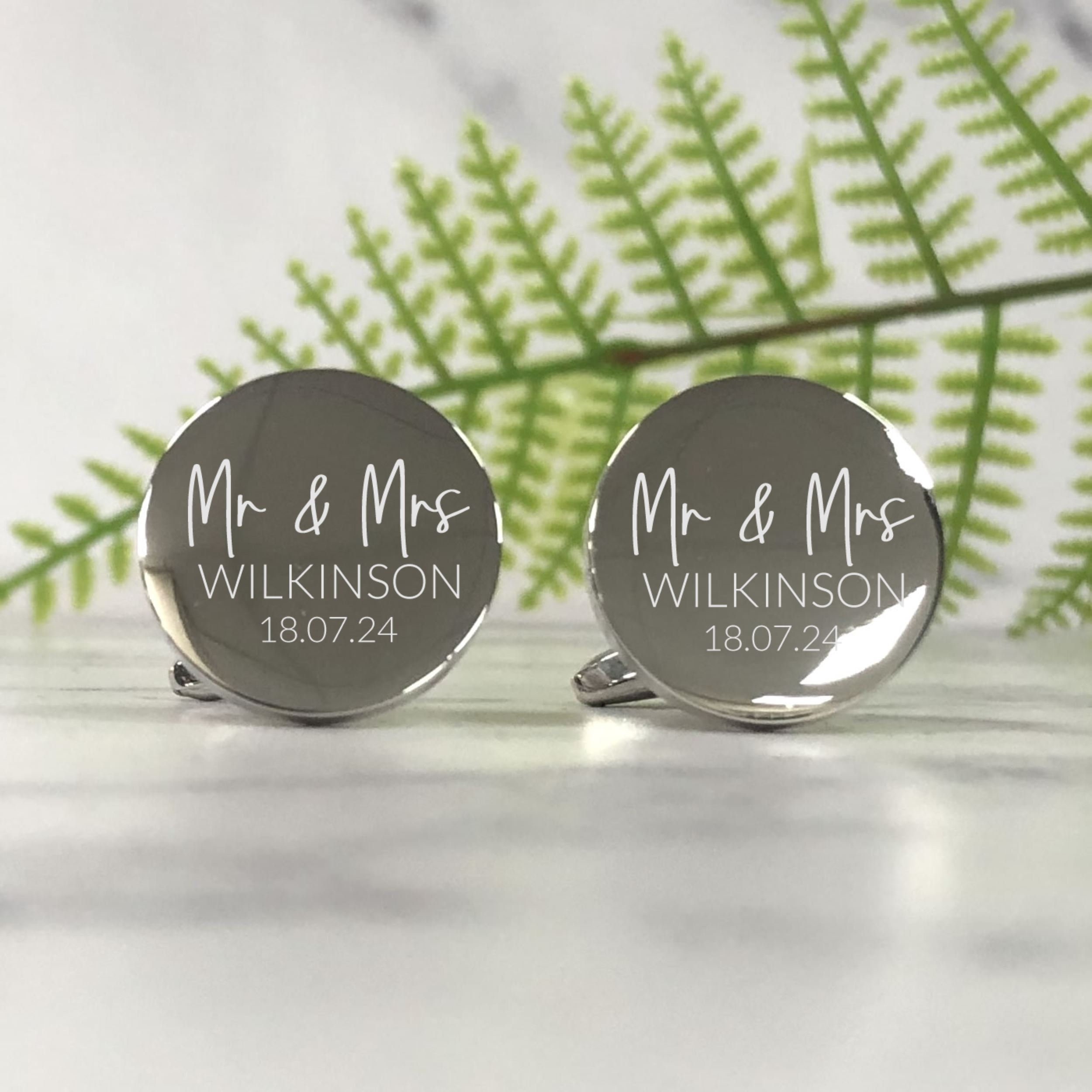 These Silver Personalised Engraved Round Mr & Mrs Cufflinks with your Titles, Surname and weddin...
