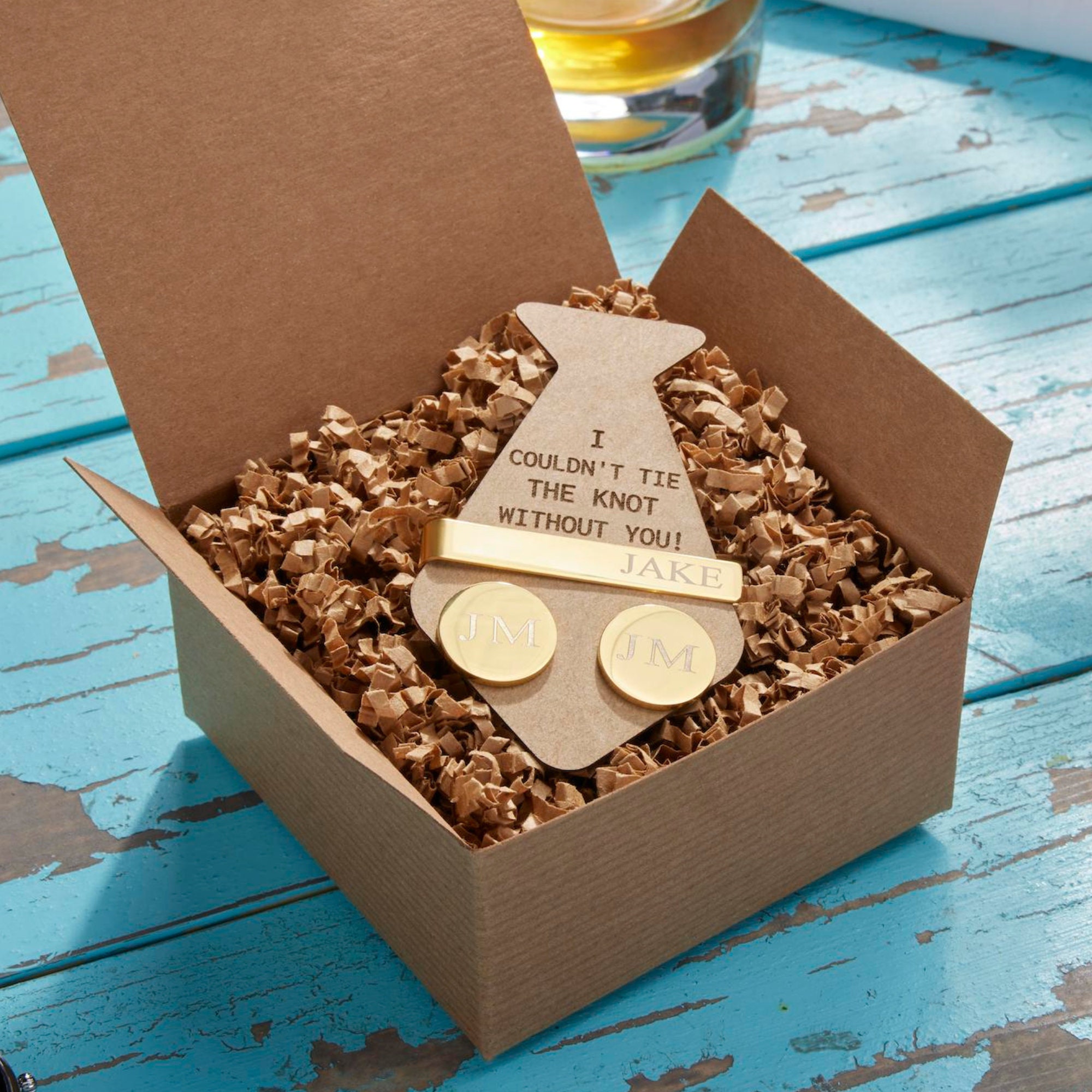 Engraved Gold Tie Clip and Engraved Cufflinks Gift Box Set, Groomsm...