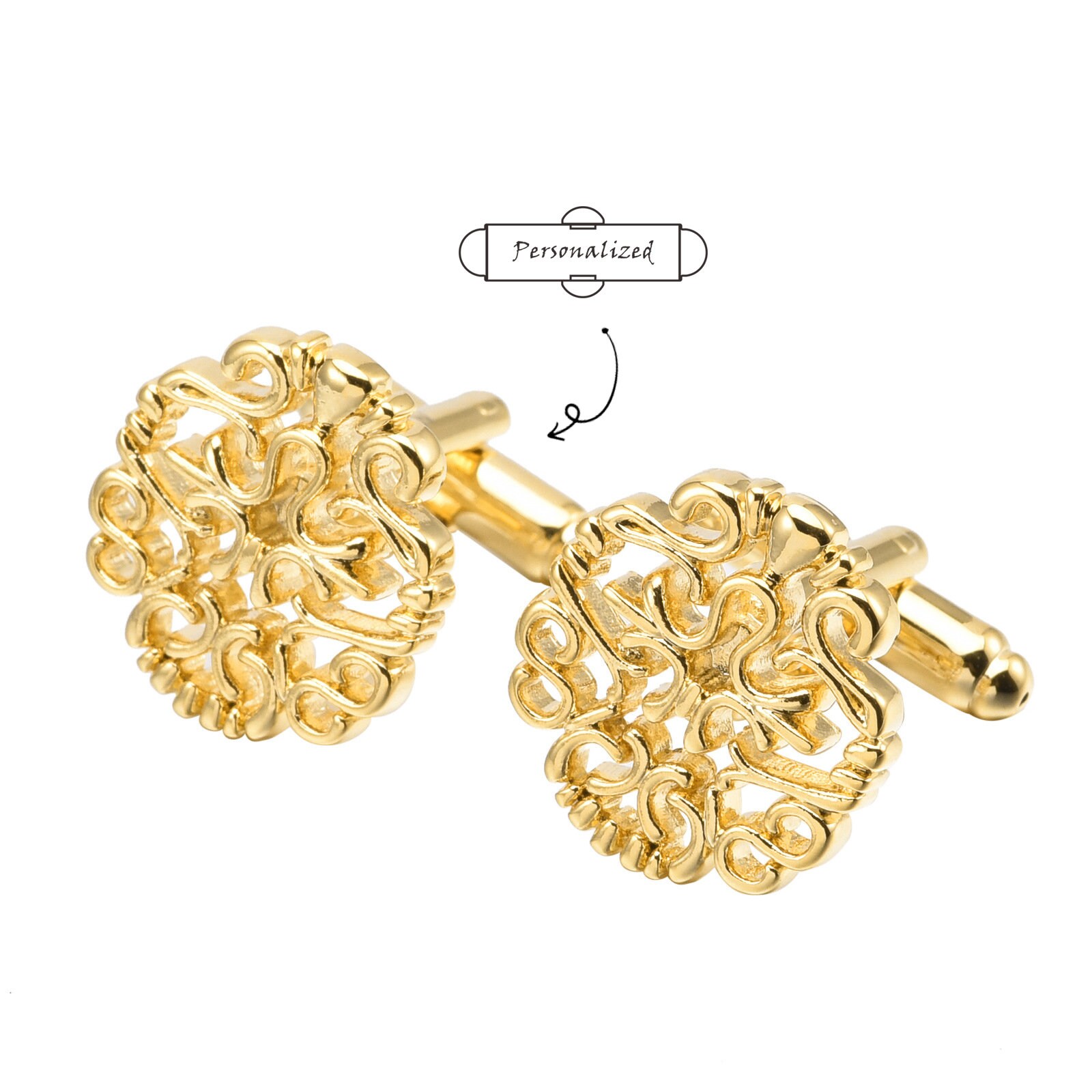 Elevate your formal wardrobe with these exquisite personalized gold filigree cufflinks. Featuring an...