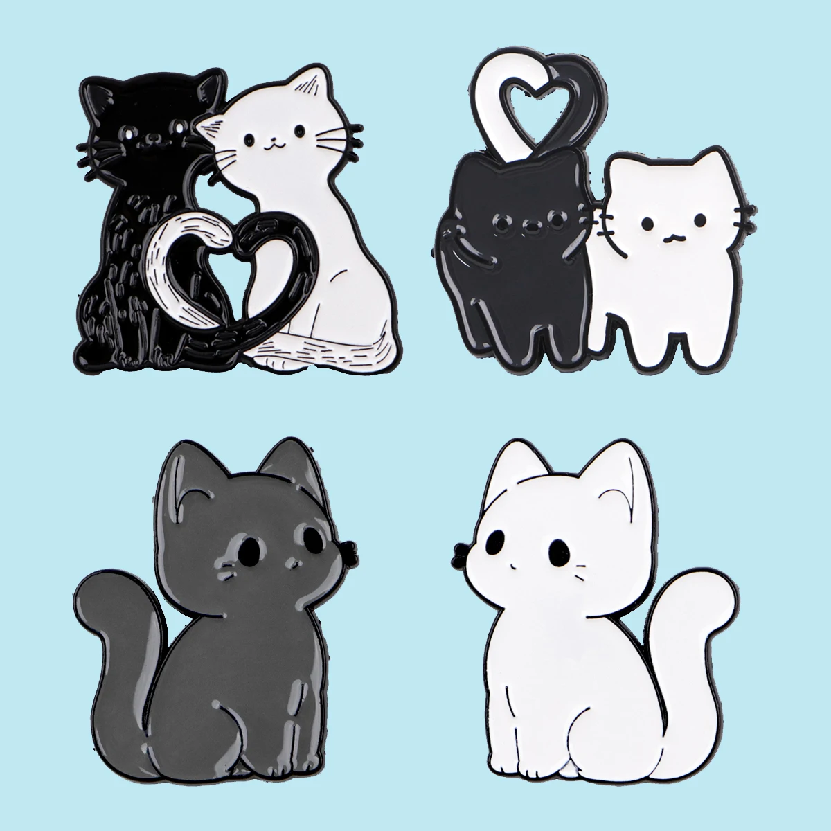 Black and White Cats Enamel Pins Metal Heart-shaped Brooch Backpack Collar Lapel Badges Fashion Jewe...