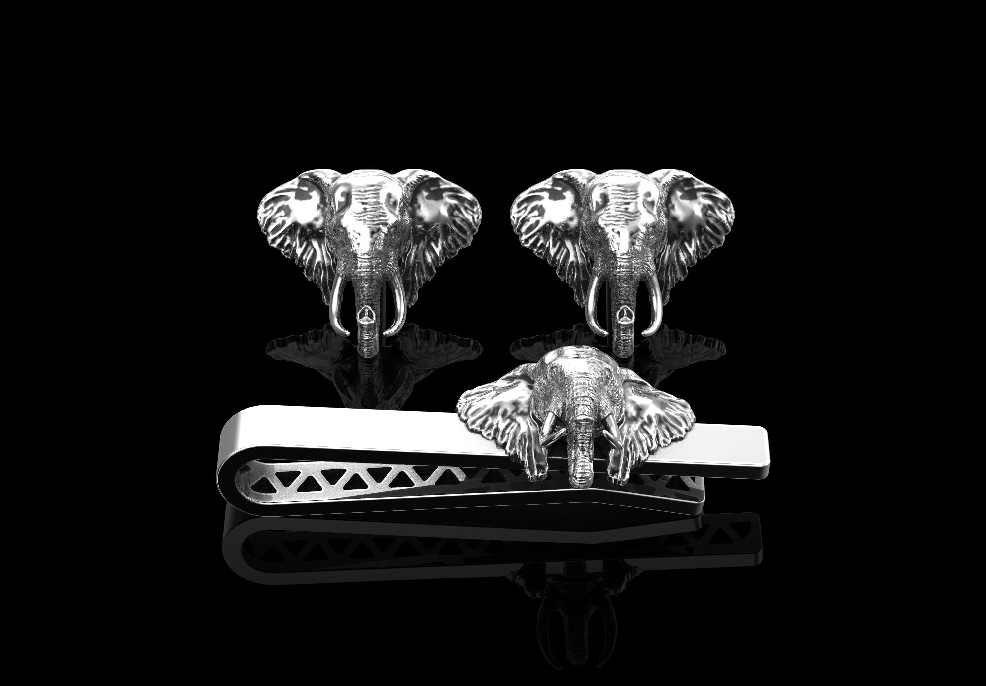 Sterling Silver Elephant Cufflinks & Tie Clip, African Elephant...