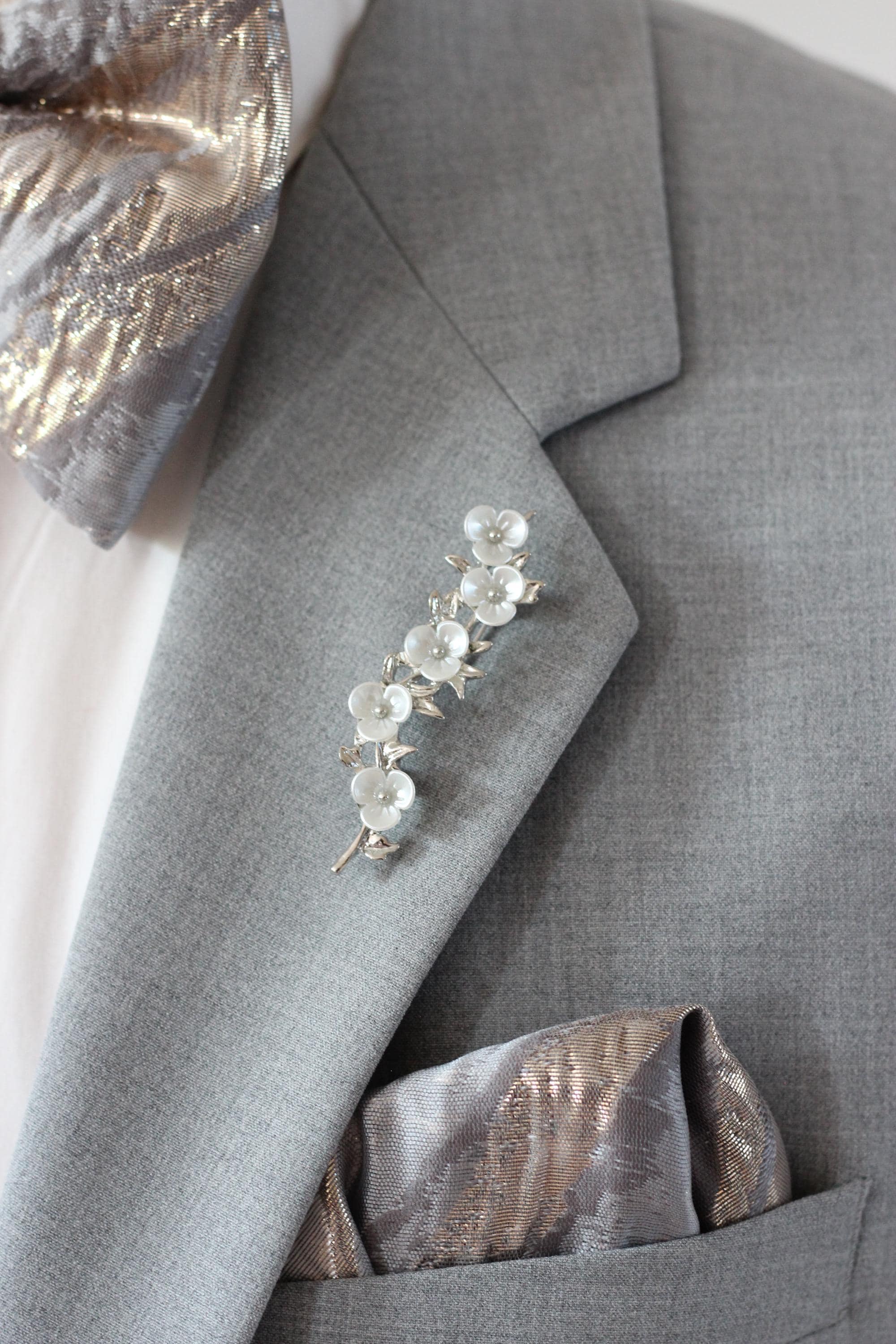 Wedding lapel flower white silver brooch shiny mens groomsmen lapel...