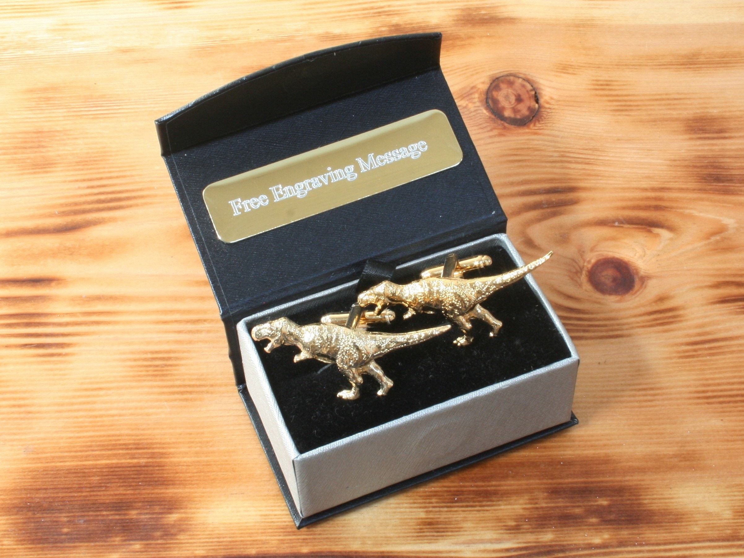 Handmade Gold Plated T-Rex Cufflinks and Tie Slide Set - Engraved G...