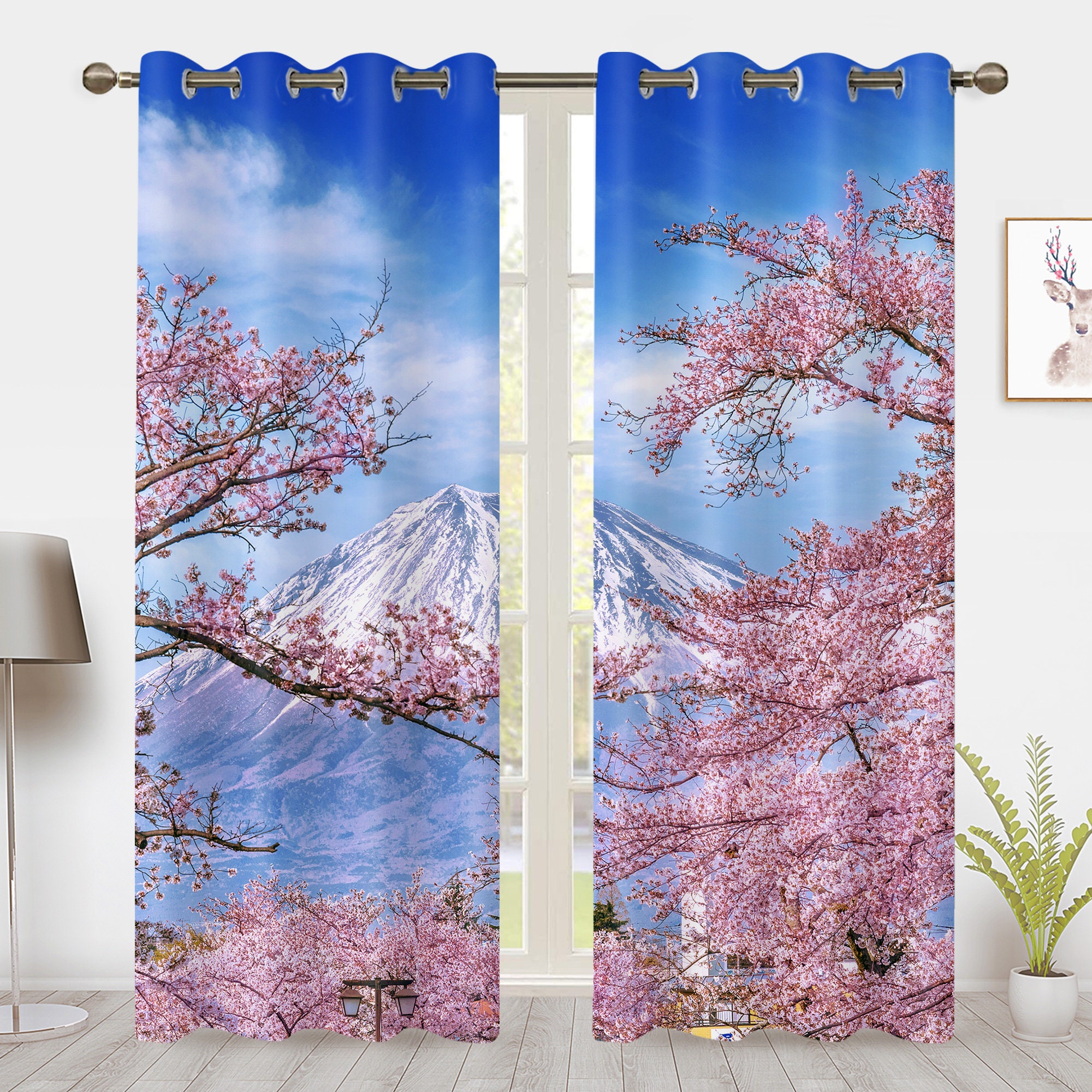 "Bring a tranquil Japanese vista to your room. These curtains showcase a pink sakura landscape ...