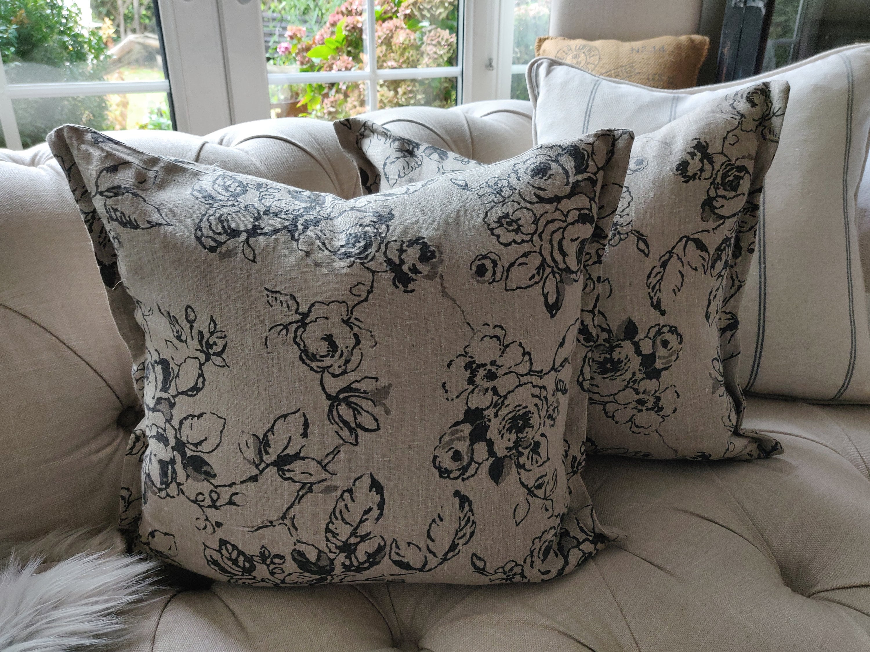 Vintage Black /Natural Rose Linen Cushion Cover. Made to measure Cu...