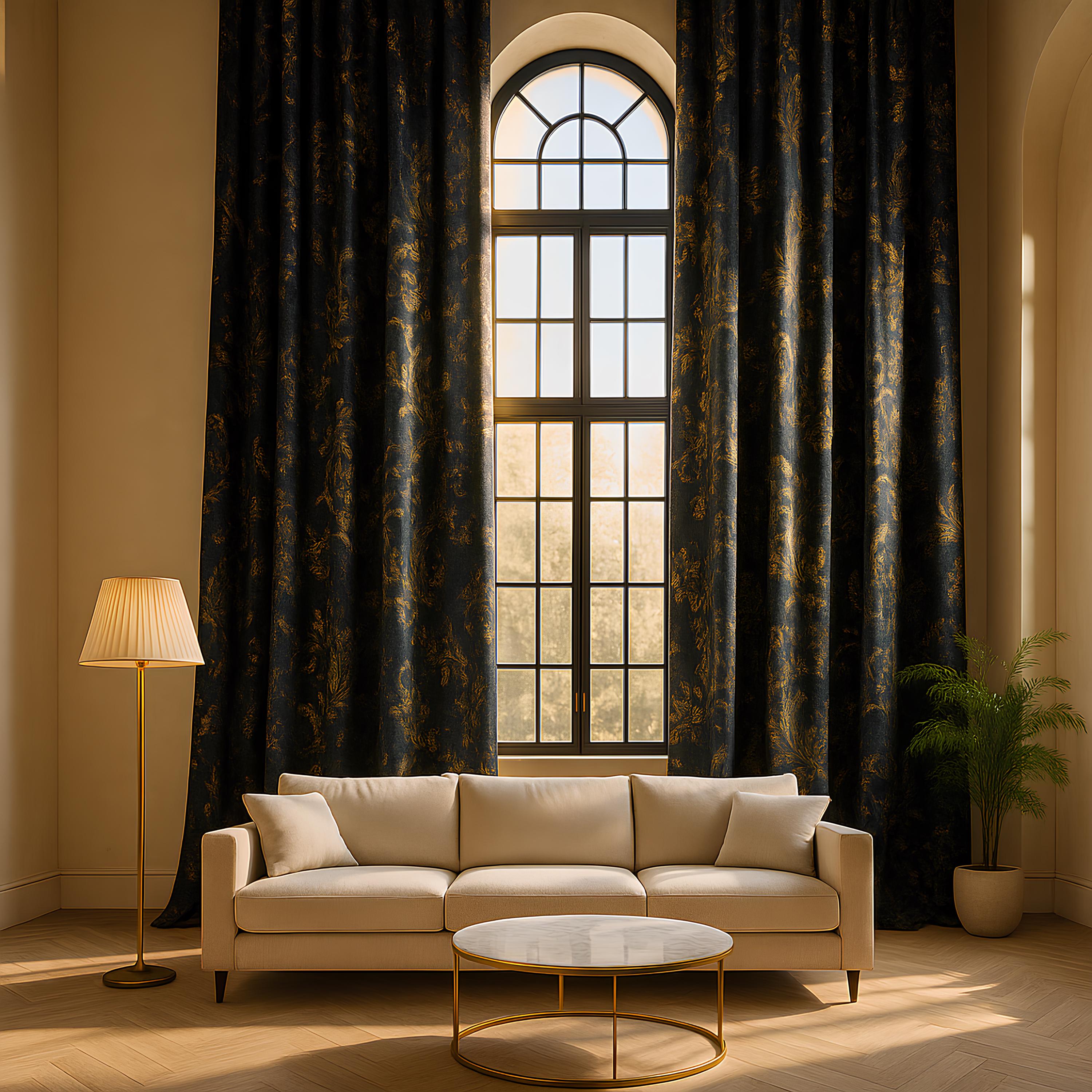 Luxury Extra Long Black Velvet Curtains with Gold Accents, High Cei...
