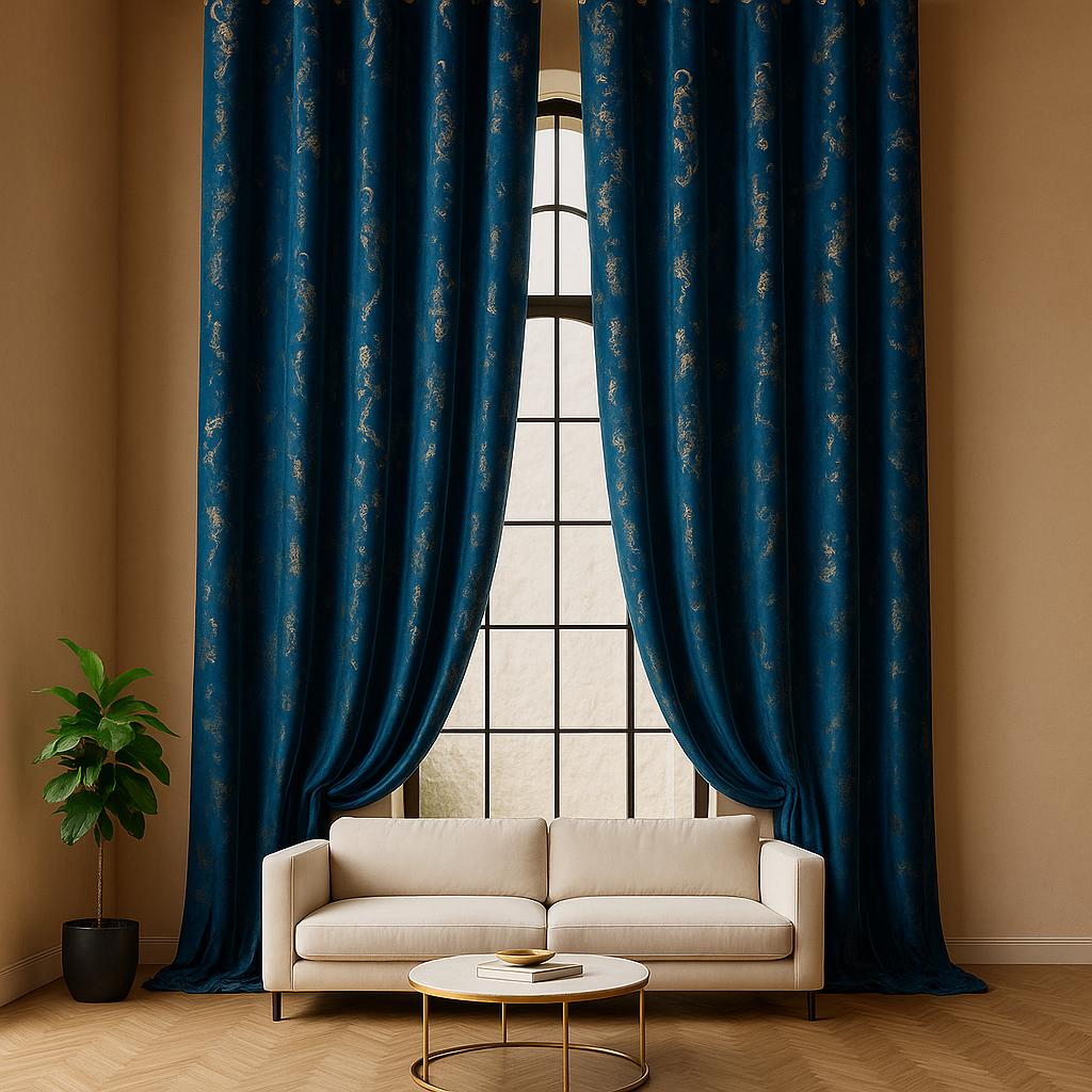 Luxury Extra Long Blue Velvet Curtains with Gold Accents, High Ceil...