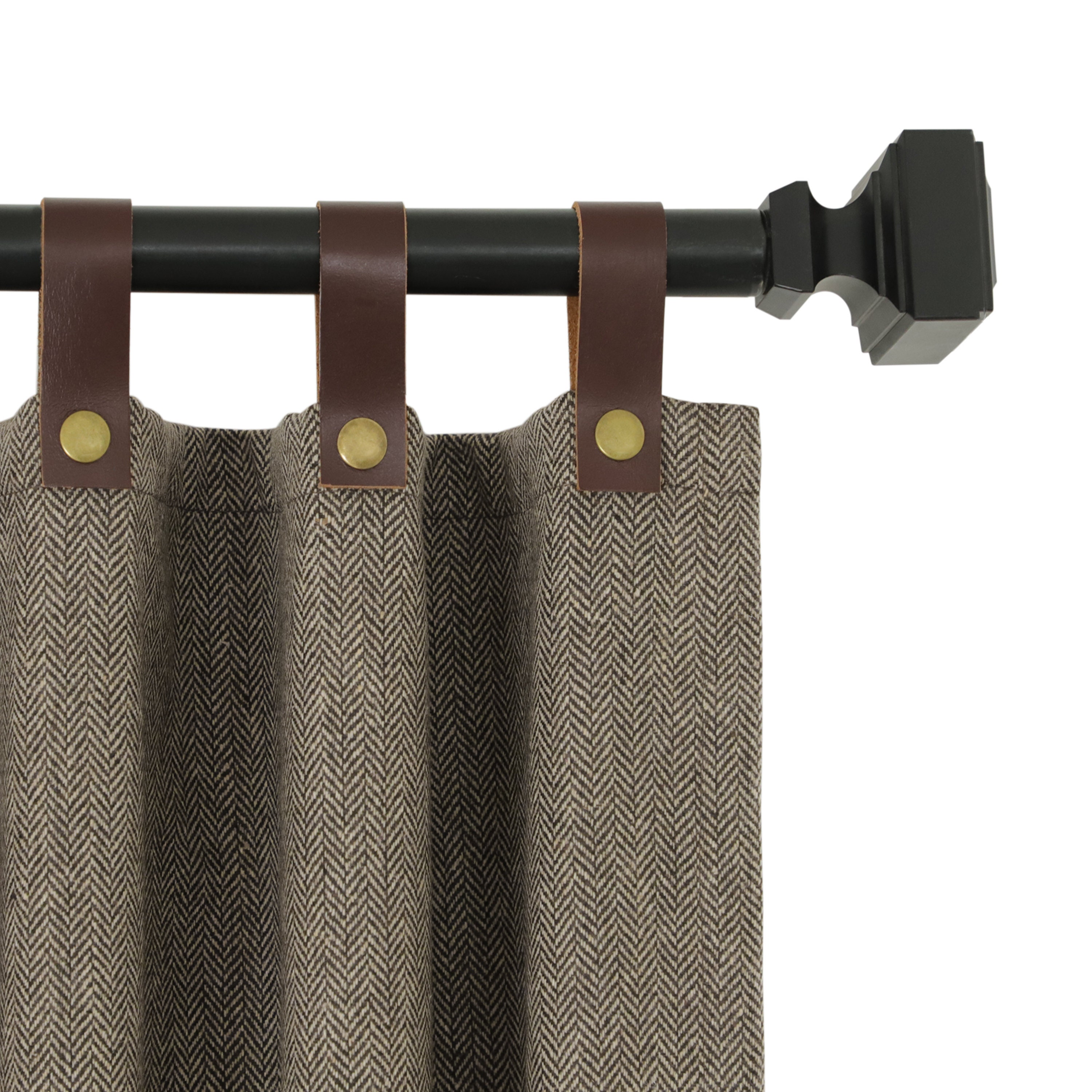 Dark taupe herringbone wool curtains with leather tab and snap button. These dressy and trendy curta...