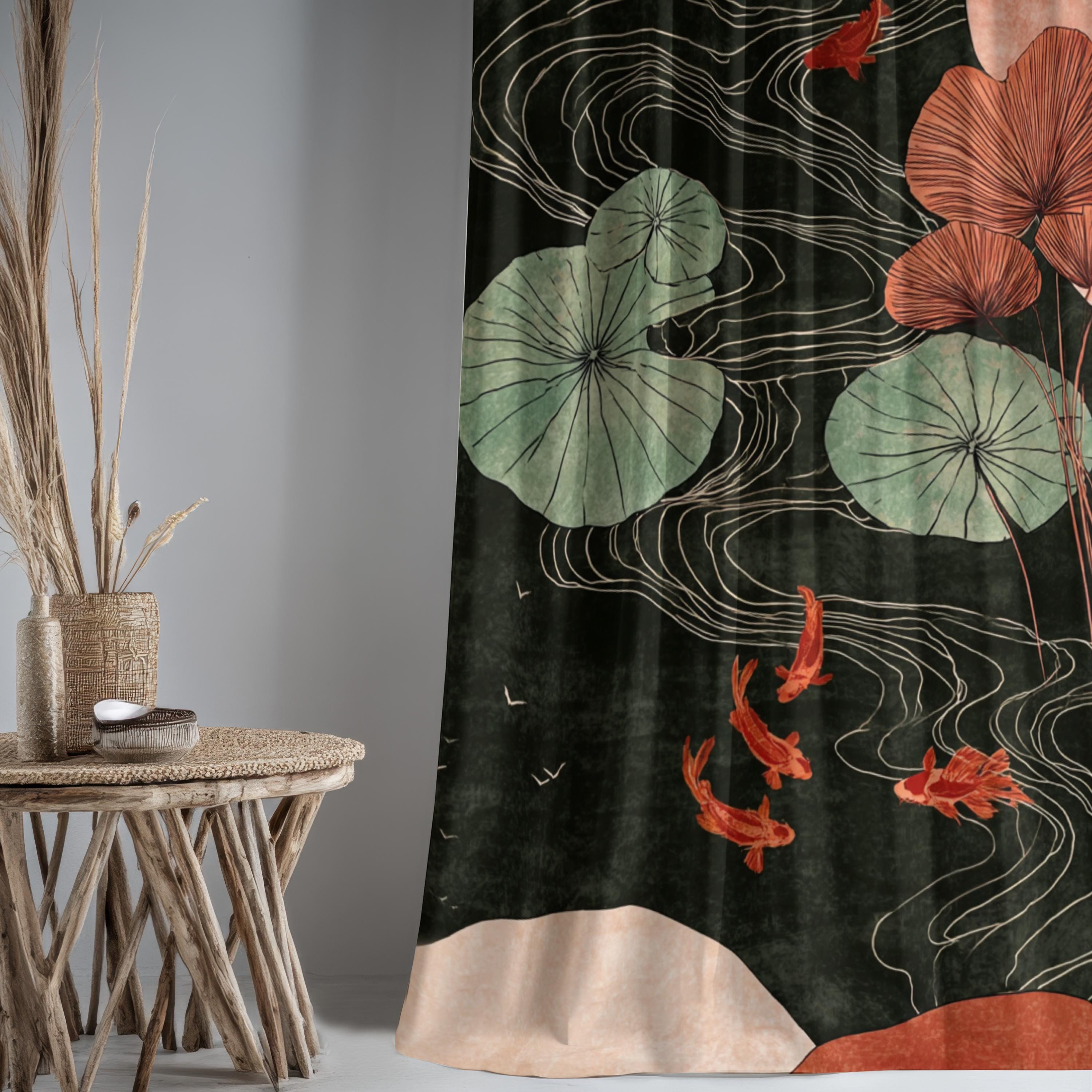 Japanese Koi Blackout Curtain, Dark Pond Art Drapes, Mistik Botanic...