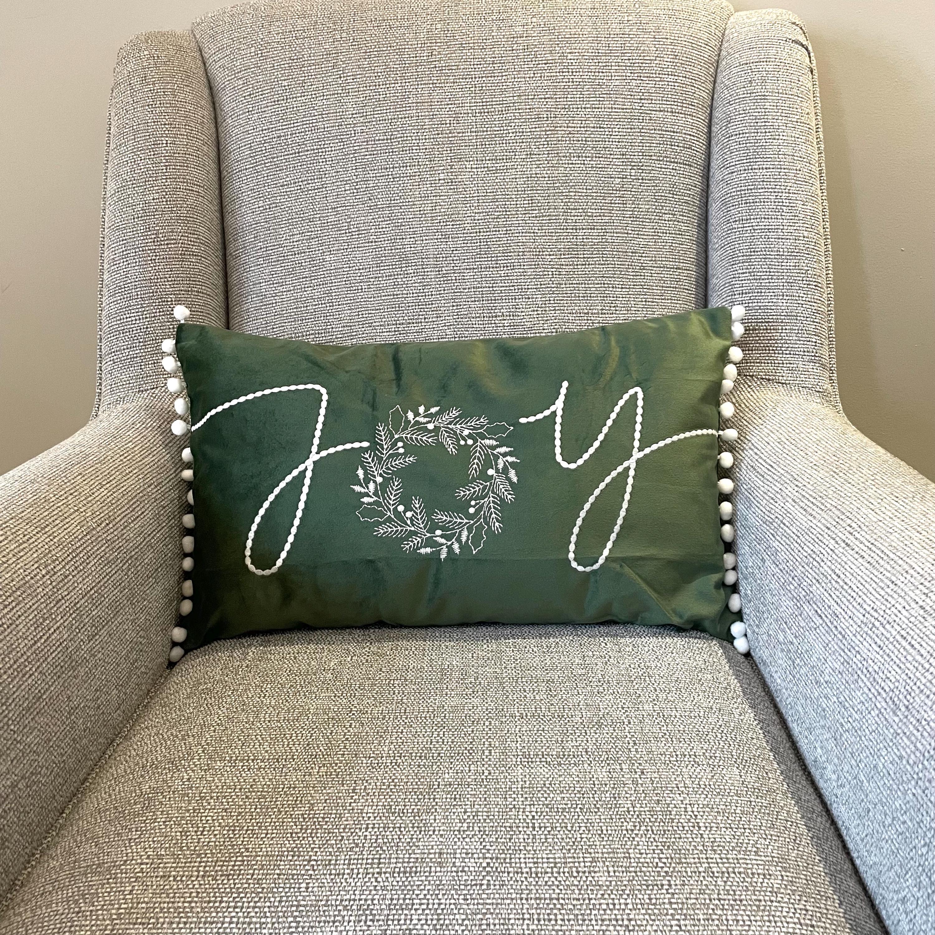 "Add this pretty velvet \"joy\" cushion cover with pom pom side detailing and wreath ...