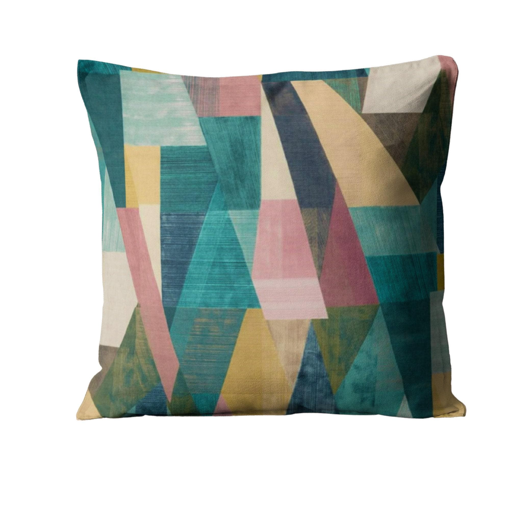 "Harlequin Fabrics Pythagorum, teal blue, turquoise. rose pink, ochre yellow velvet cushion cov...