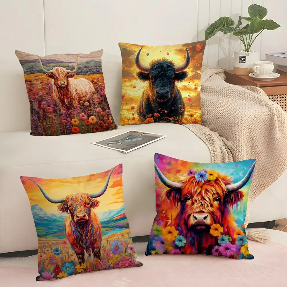 Vibrant Highland Cow Pattern Cushion Cover Silky Short Plush with Invisible Zipper Dustproof Sofa Pi...