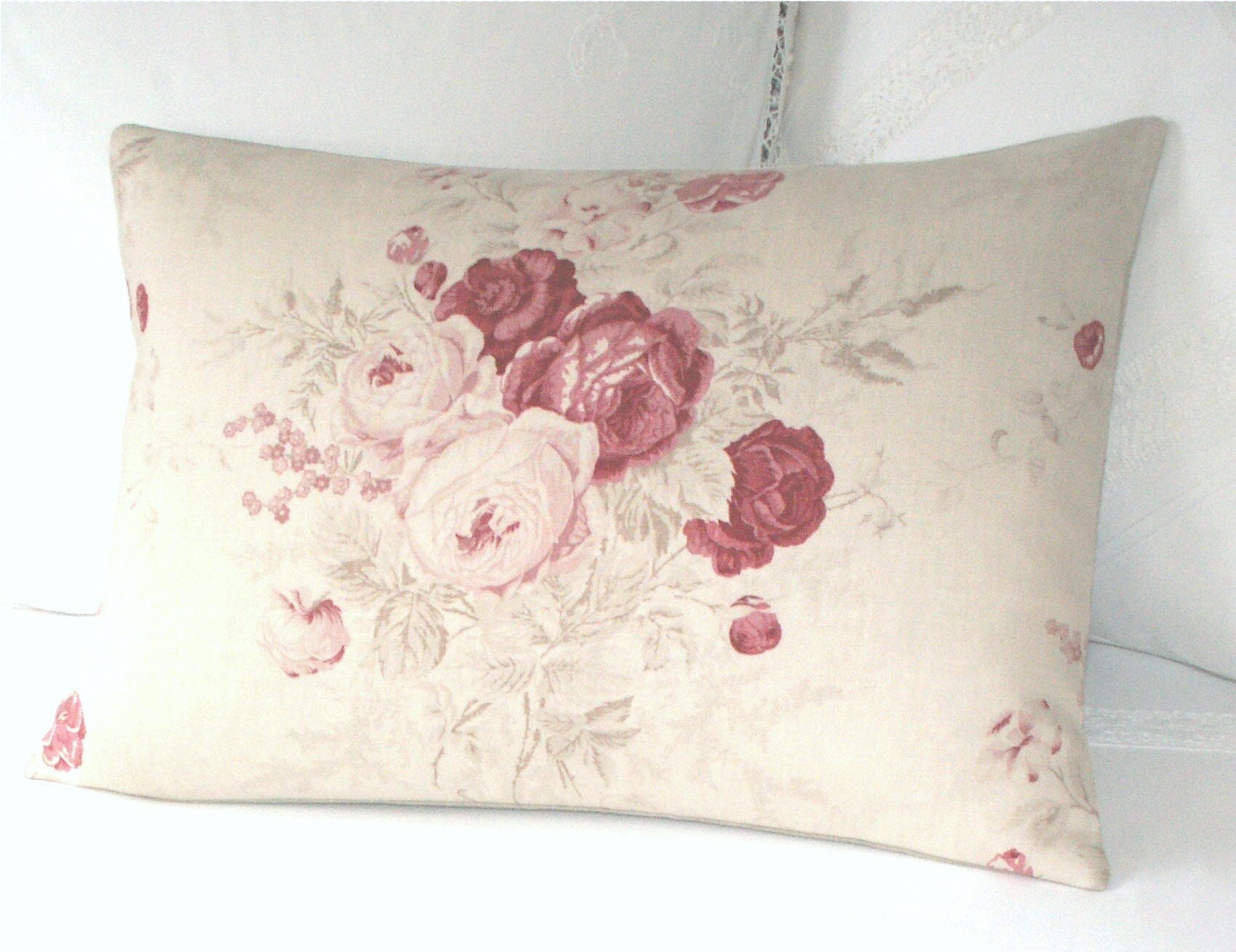 "Handmade cushion / pillow cover in UK designer Kate Forman classic Red Roses linen. Bold raspb...