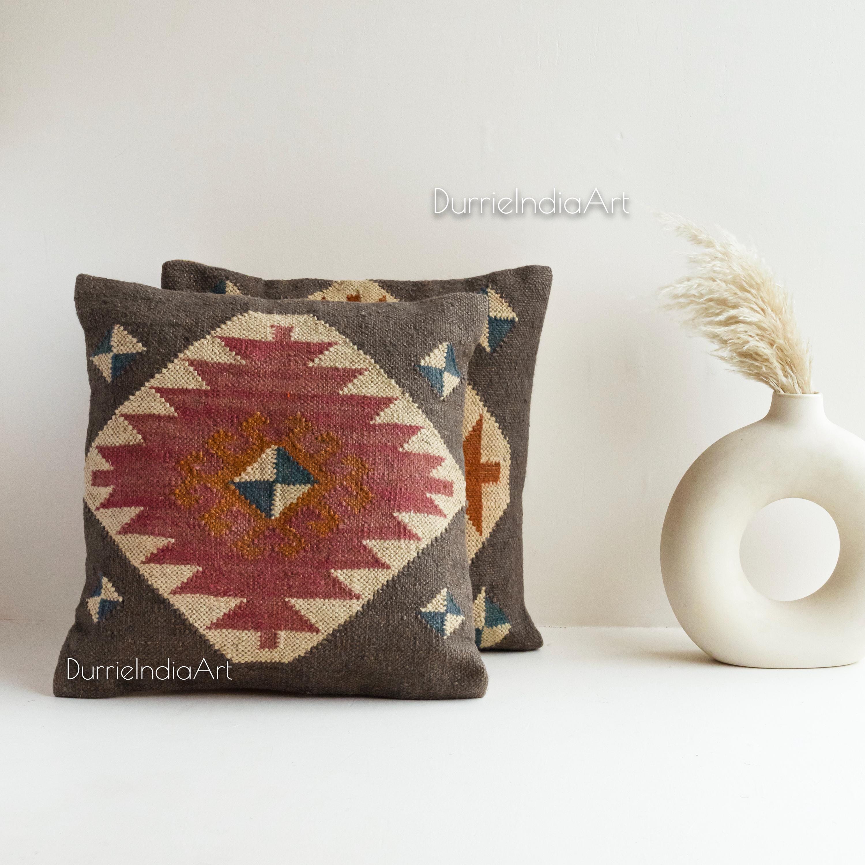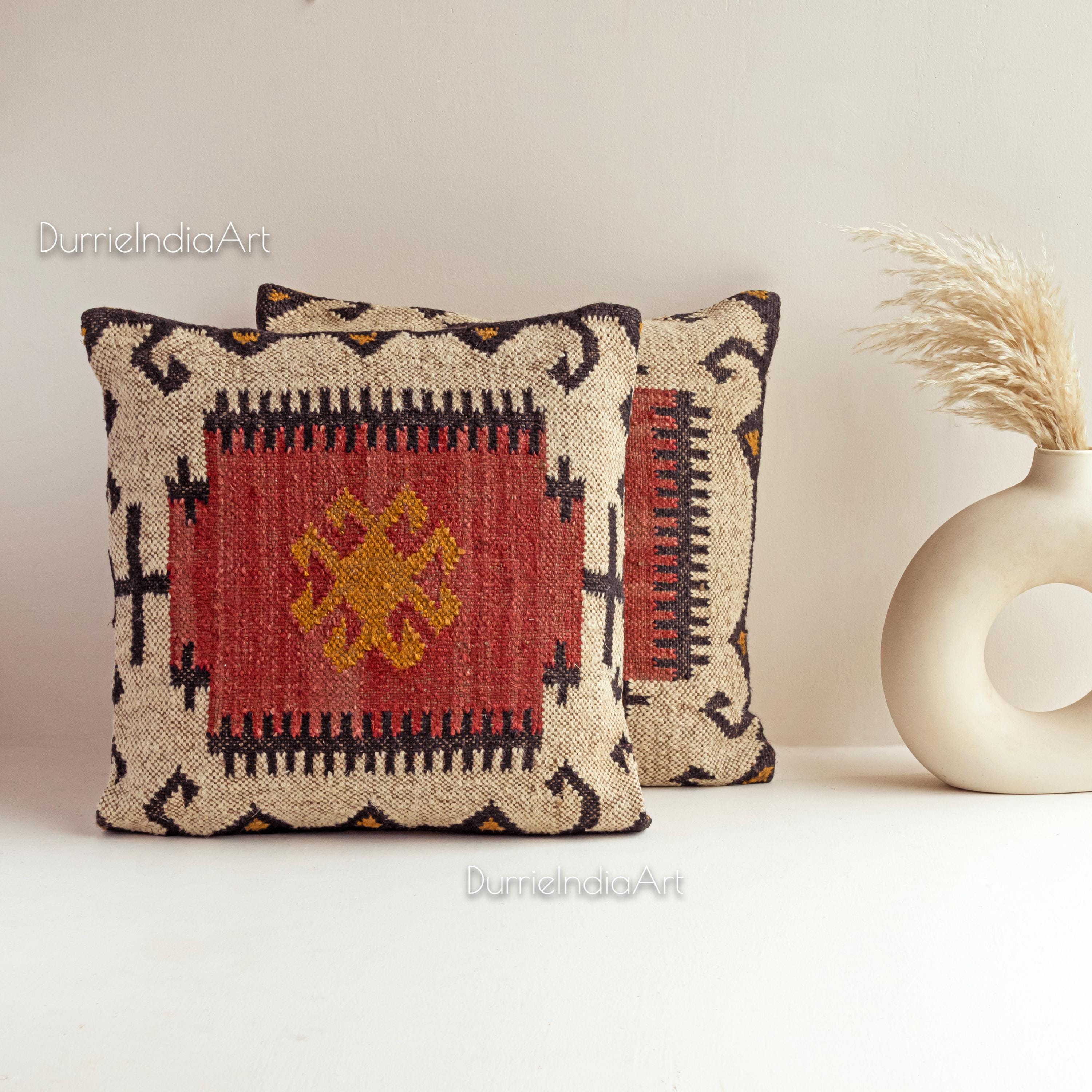 Aztec Jute Kilim Pillow Cover Set, Vintage Turkish Moroccan Decor Indian Hand Woven Wool Jute Cushio...