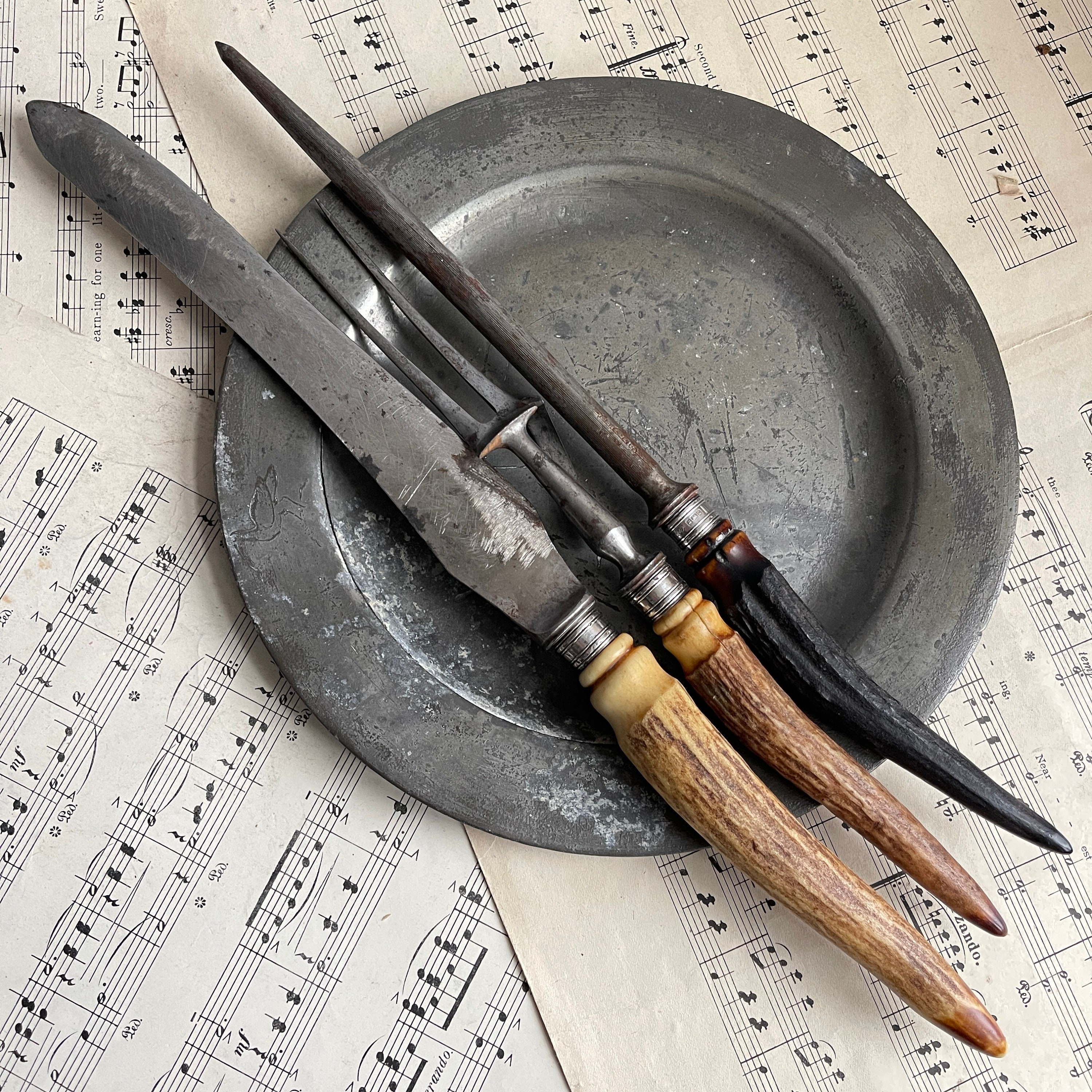 Antique Antler Handled Carving Set. Silver Ferrules. Antique Flatwa...