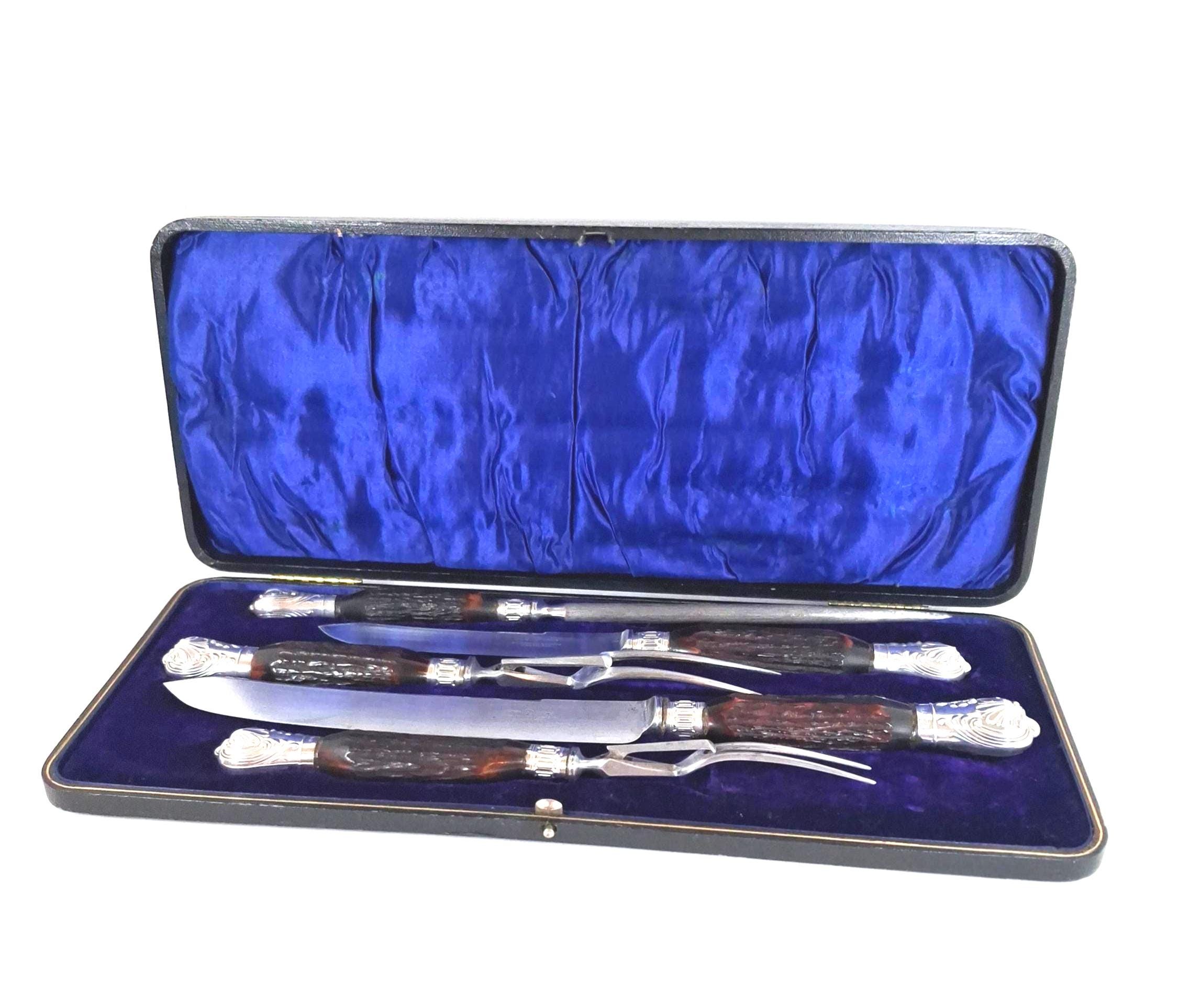 Edwardian Sterling Silver & Antler Carving Set, Antique Meat Ca...