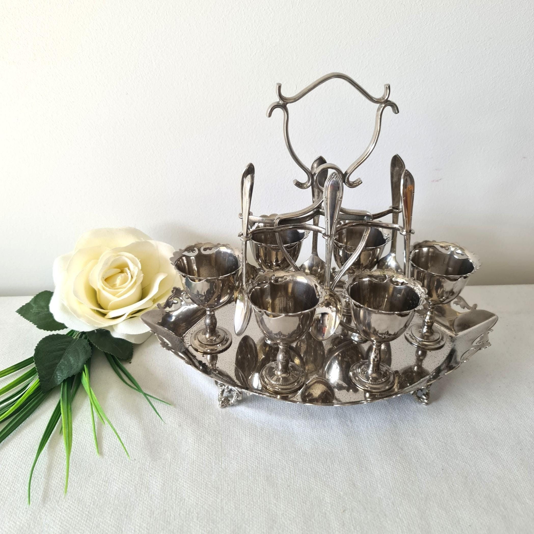 Lovely antique Edwardian quality silver plated egg cruet set, having a quality silver plated stand w...