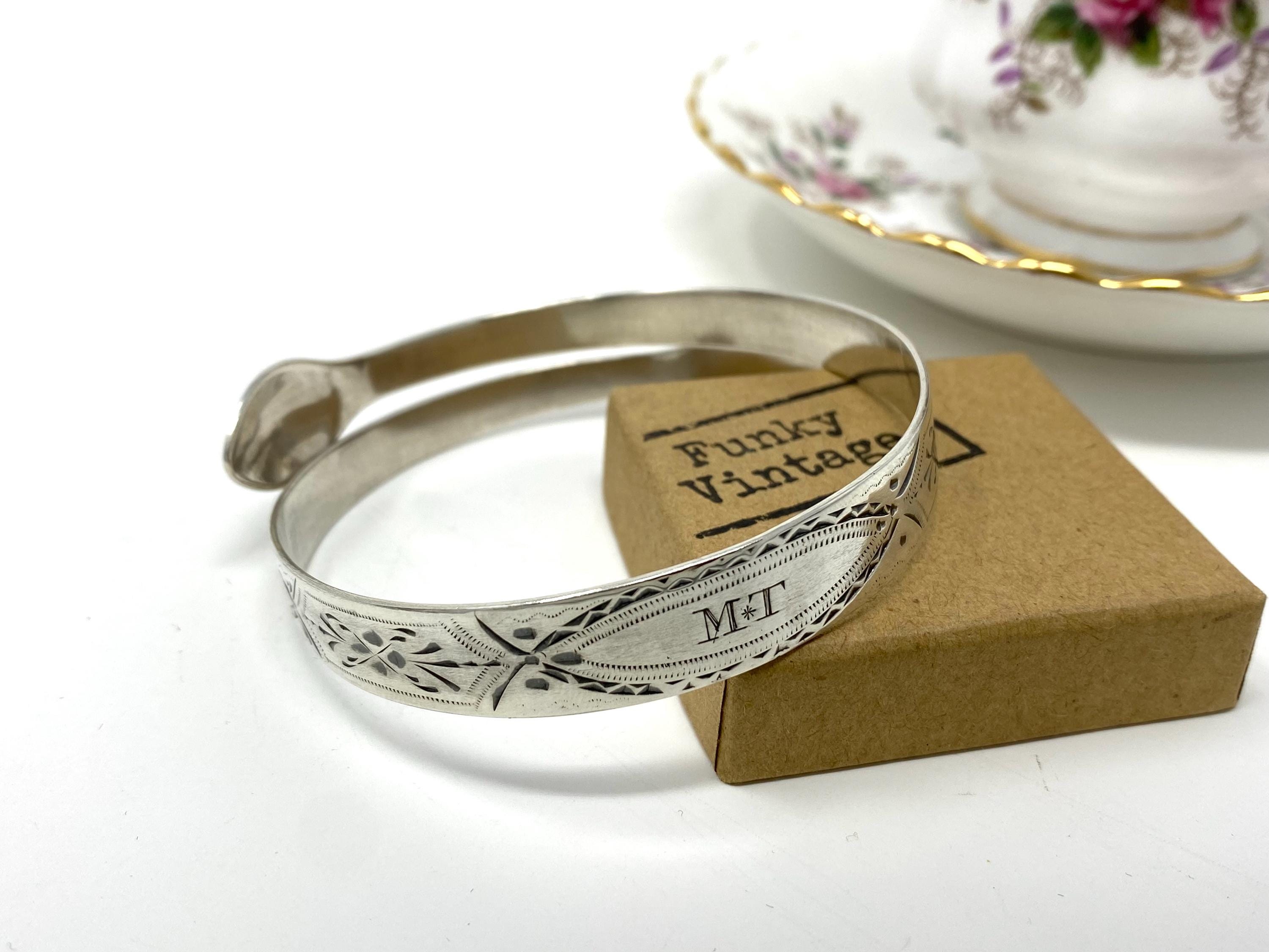 This is a stunning solid silver tong bangle with fabulous bright cut details. This gorgeous bangle h...