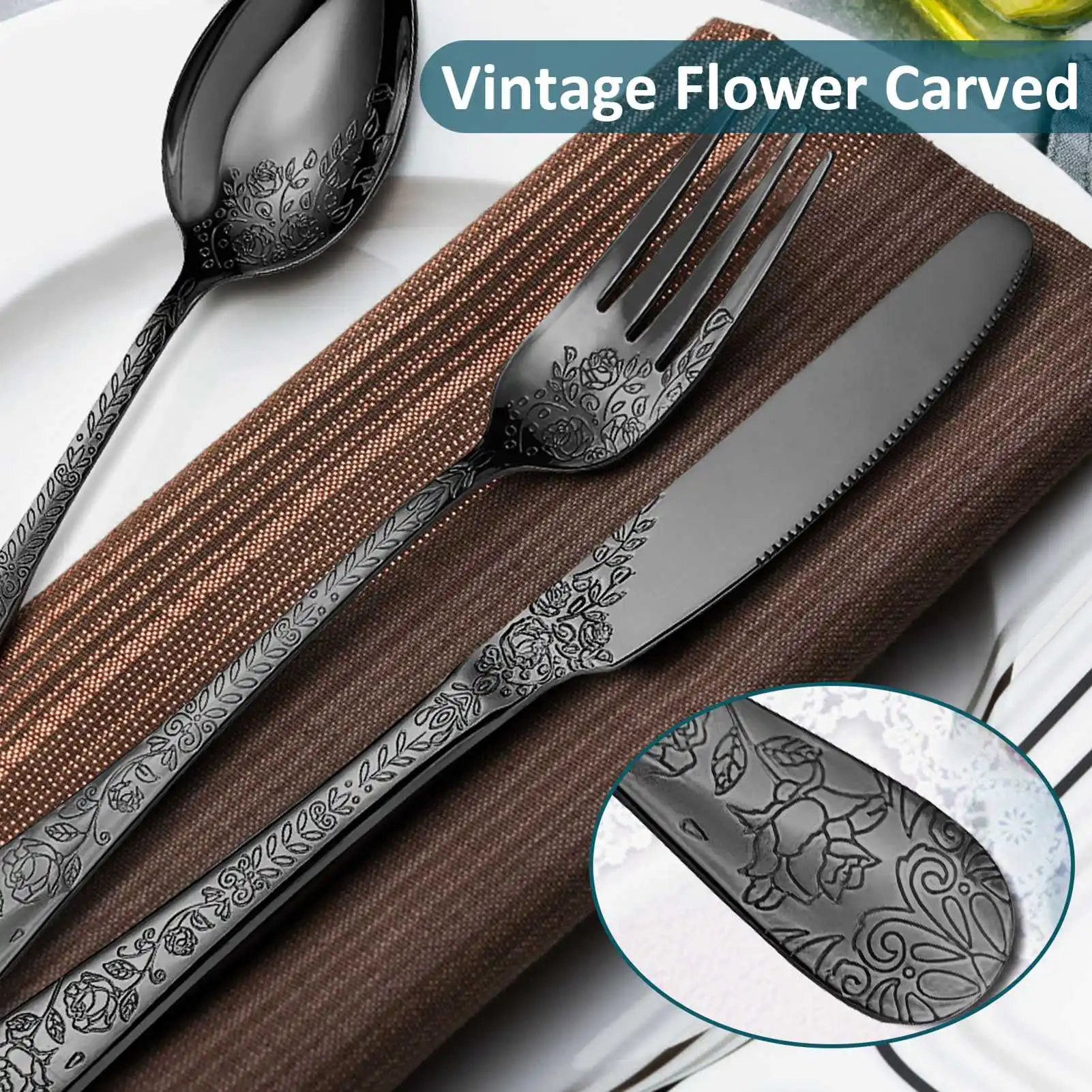 20Pcs Floral Carved Flatware Forks Spoons Silver Black Elegant Vintage Tableware Set for Home Kitche...