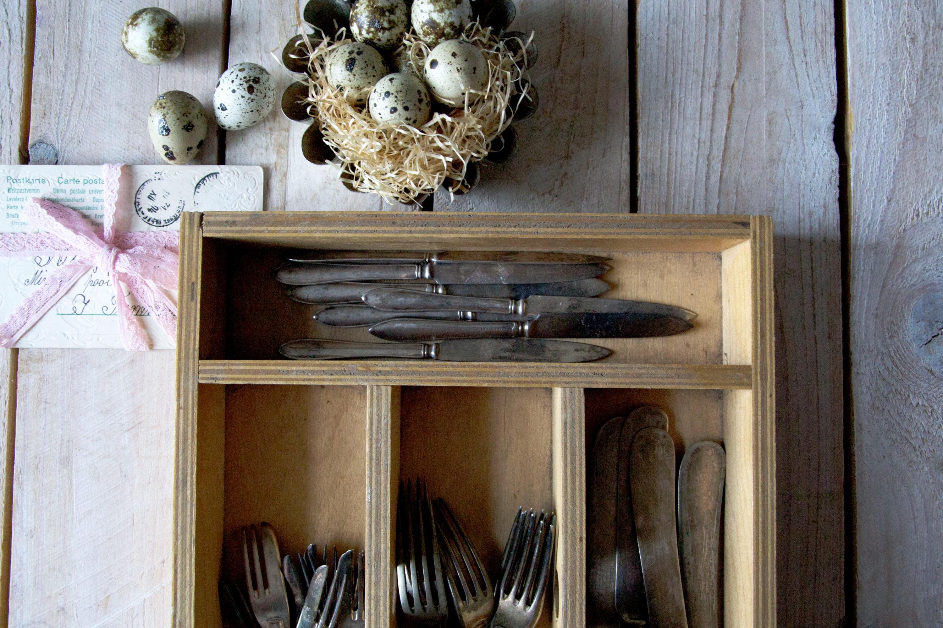 Vintage Wooden Cutlery Box - Rustic Flatware Organizer - Display Tr...