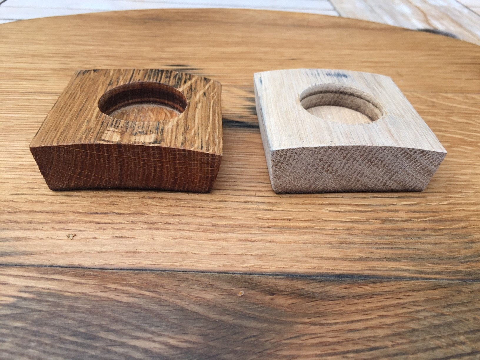 Solid oak single tea light candle holder. Made from a stave from a genuine scotch malt whisky barrel...