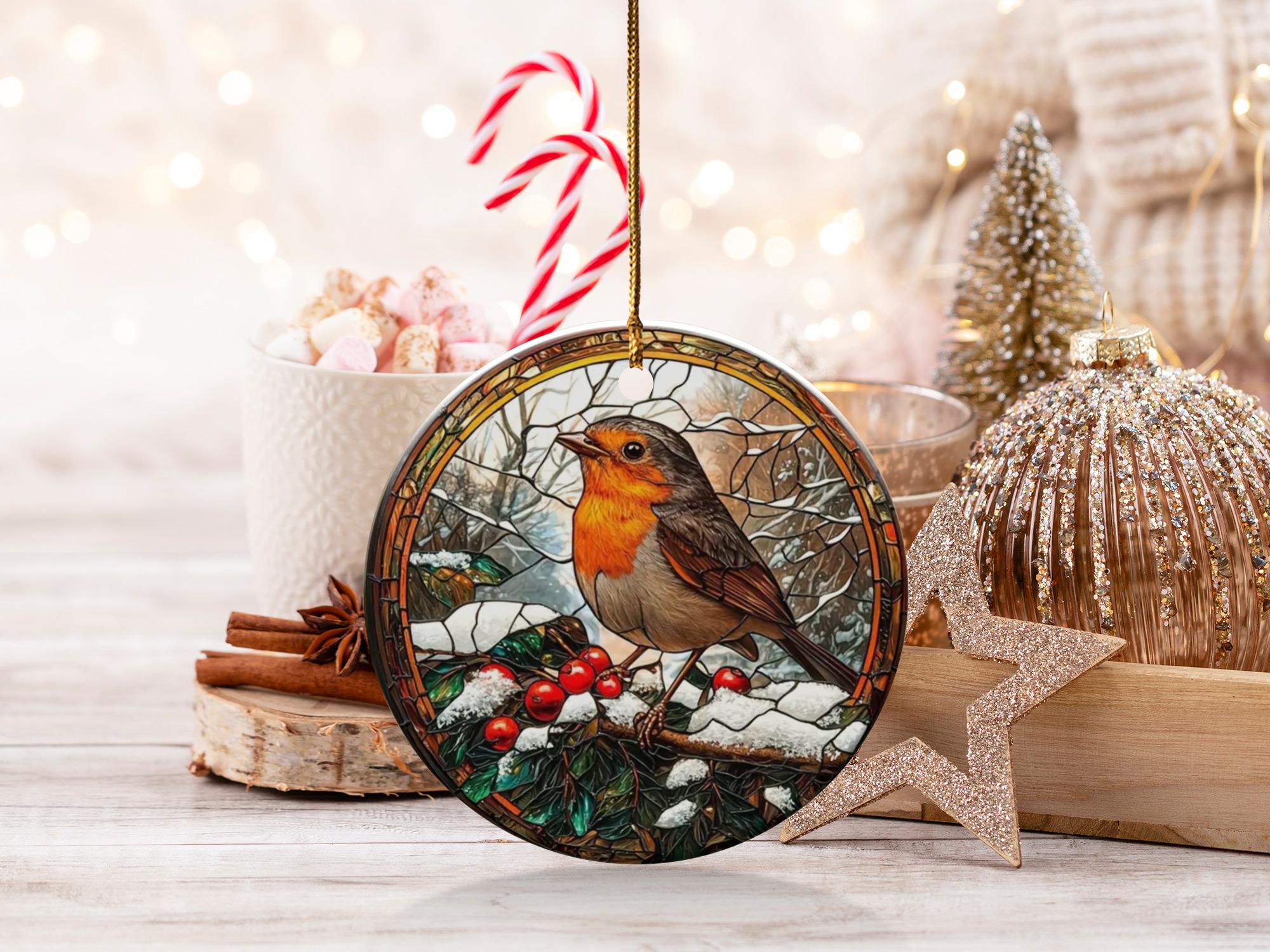 Robin Ornament, Winter Bird Ornament, Christmas Ornament, Stained G...