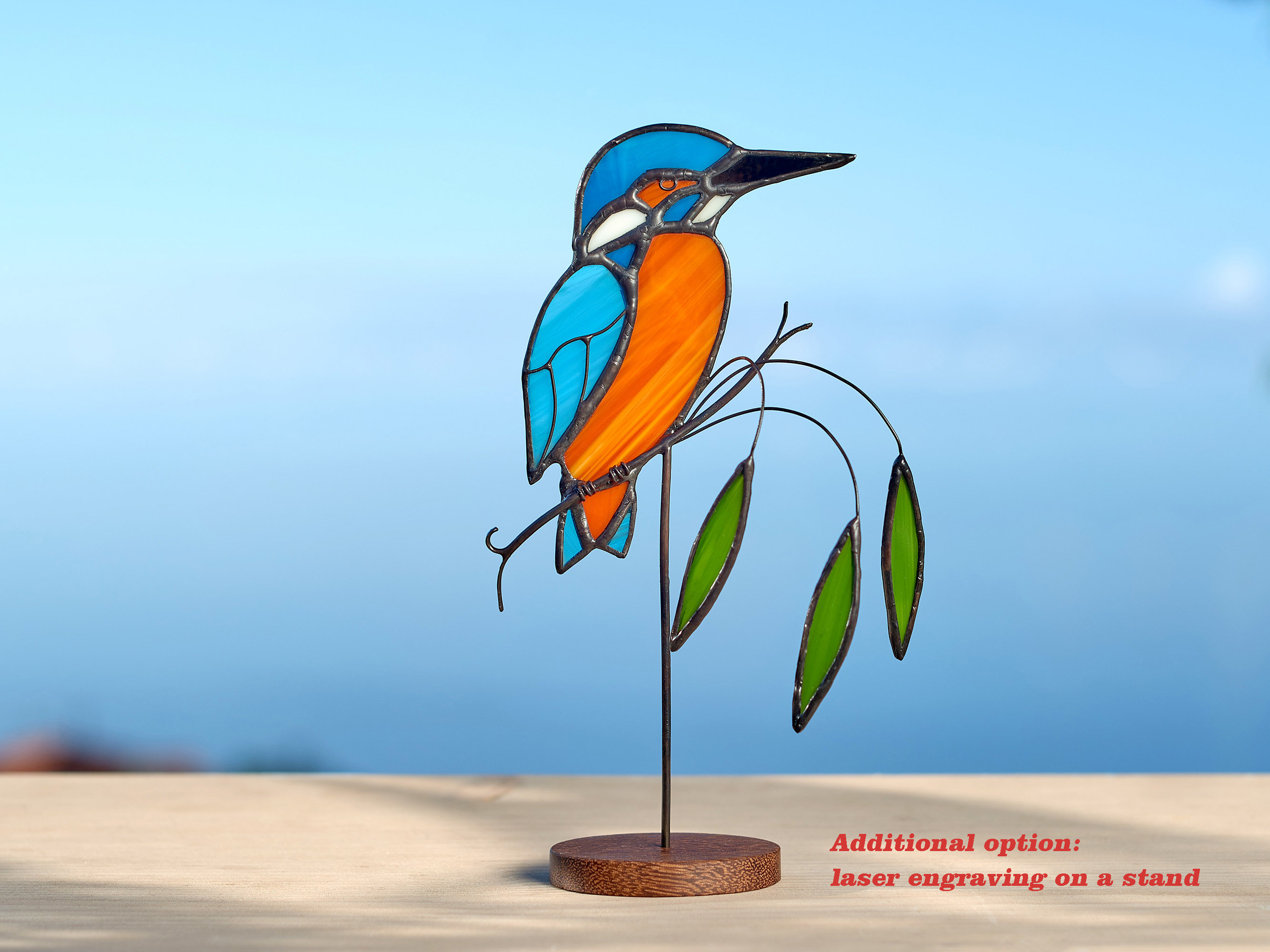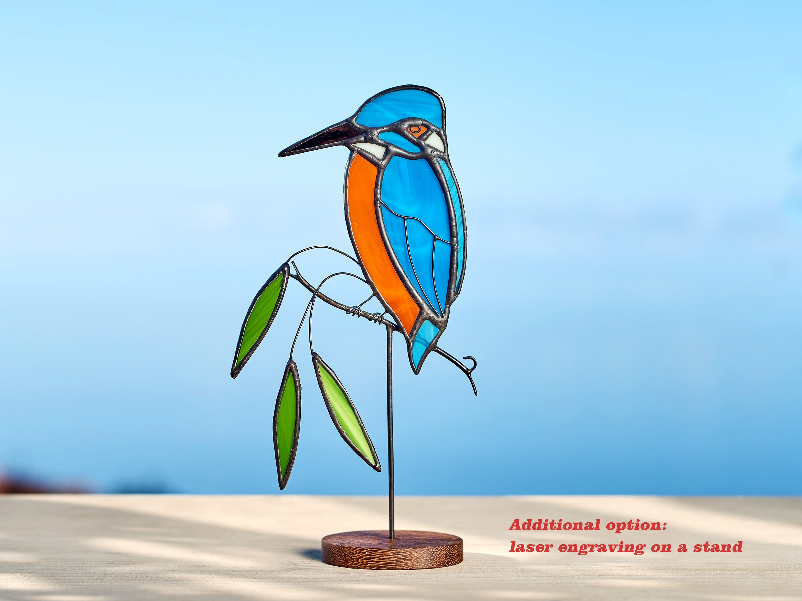Stained glass kingfisher on the wooden stand Stained glass bird Gar...