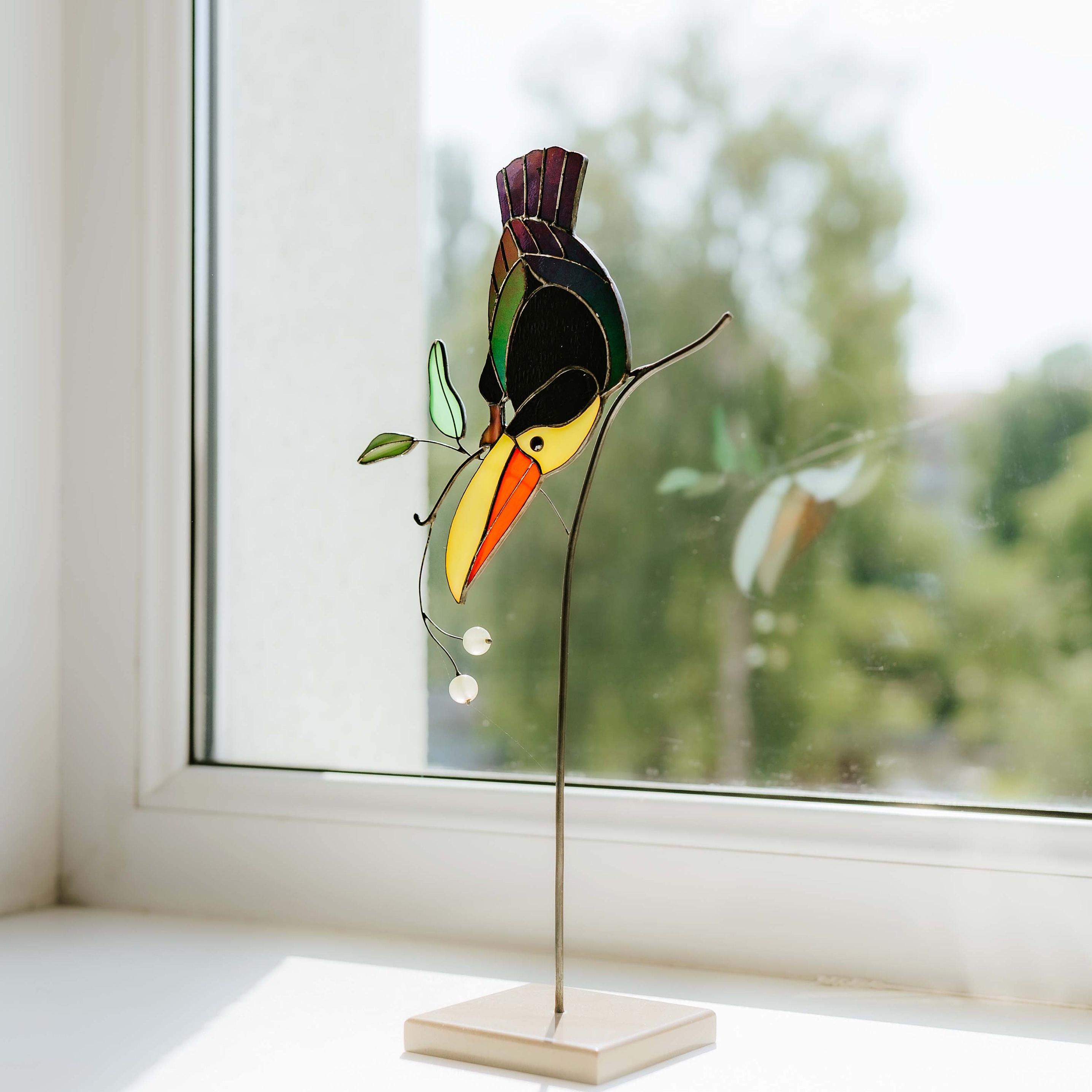 Handmade stained glass toucan table decor, colorful bird sculpture and window suncatcher that bright...